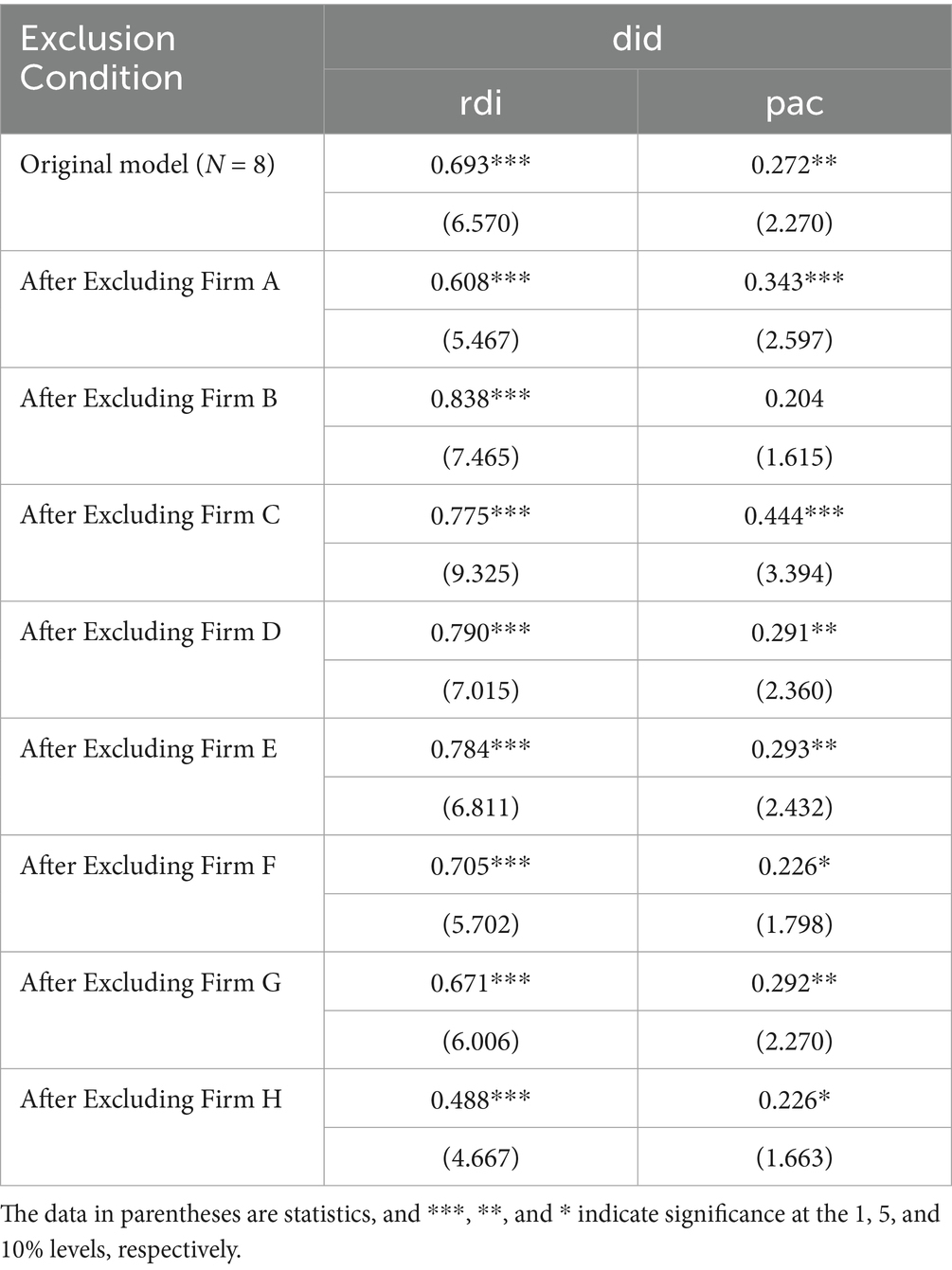 Due to the large difference in sample sizes between the treatment group (N = 8) and the control group (N = 88), concerns regarding the statistical power and generalizability of the findings may arise. To address this issue, this study conducted a sensitivity analysis using a jackknife procedure, where one firm from the treatment group was sequentially excluded, and the regression models were re-run. The results are presented in Table 7. The firms in the treatment group are Firm A to Firm H.