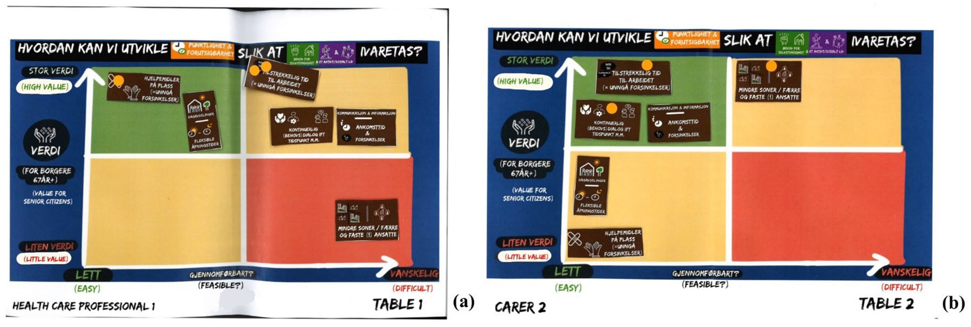 Established design methods such as 2×2 matrices and dot voting (25, 37) were modified for the design workshops of this study. The 2×2 matrices were developed for individual use and after individual dot voting, participants were asked to compare and discuss their individual assessments in pairs, before sharing in a larger group. The intention was to support reflective processes through active participation and psychological safety. This appeared to be a useful approach for all design workshops in which participants collaborated and helped each other in pairs and groups. An even distribution of different stakeholder groups further supported the participation of senior citizens, who could ask their “neighbor” for clarification and help.