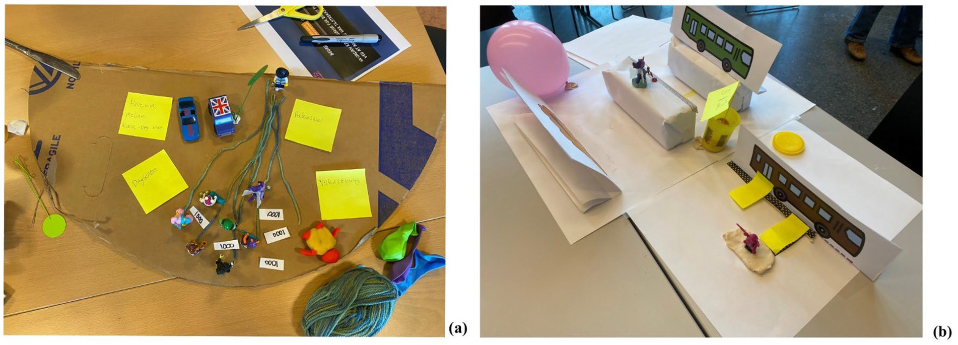 Figure 2. Examples of prototype building to improve timely home care provision in workshop 4 (a), and age-friendly mobility in workshop 9 (b). © 2023 Christophe Eward Kattouw.