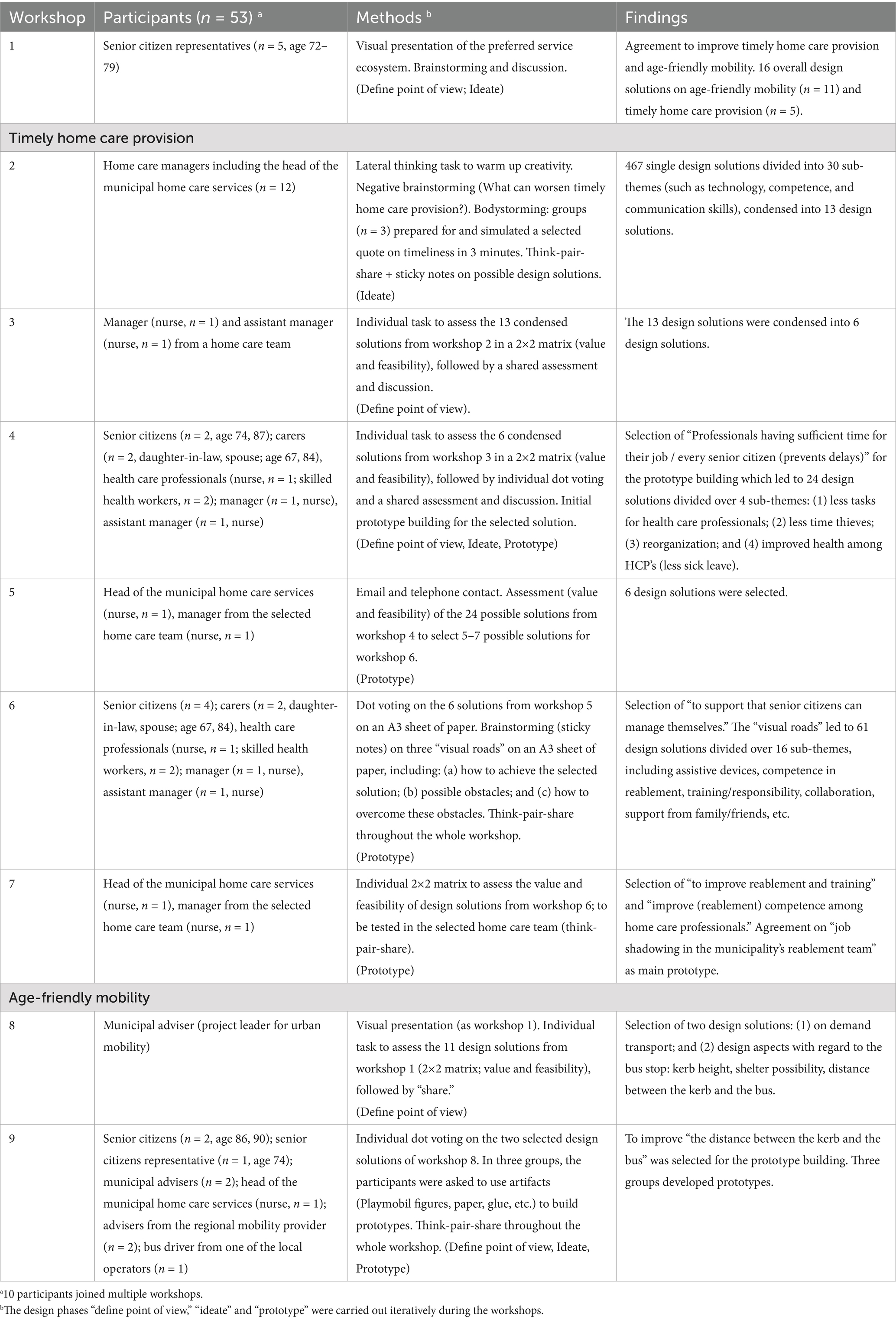 The workshops followed the three iterative phases of design thinking: define point of view, ideate, and prototype. Defining the point of view involves selecting a specific area for improvement to guide the ideation phase (34). Two improvement areas were selected based on previous input from the involved stakeholder groups: age-friendly mobility and the continuity of health services (35). Based on “How might we” questions, potential solutions were generated through brainstorming processes. The results then formed the foundation for developing prototypes (34). Prototypes or potential design solutions are detailed design proposals which address how things might be experienced and implemented differently in the future (24, 25, 33).