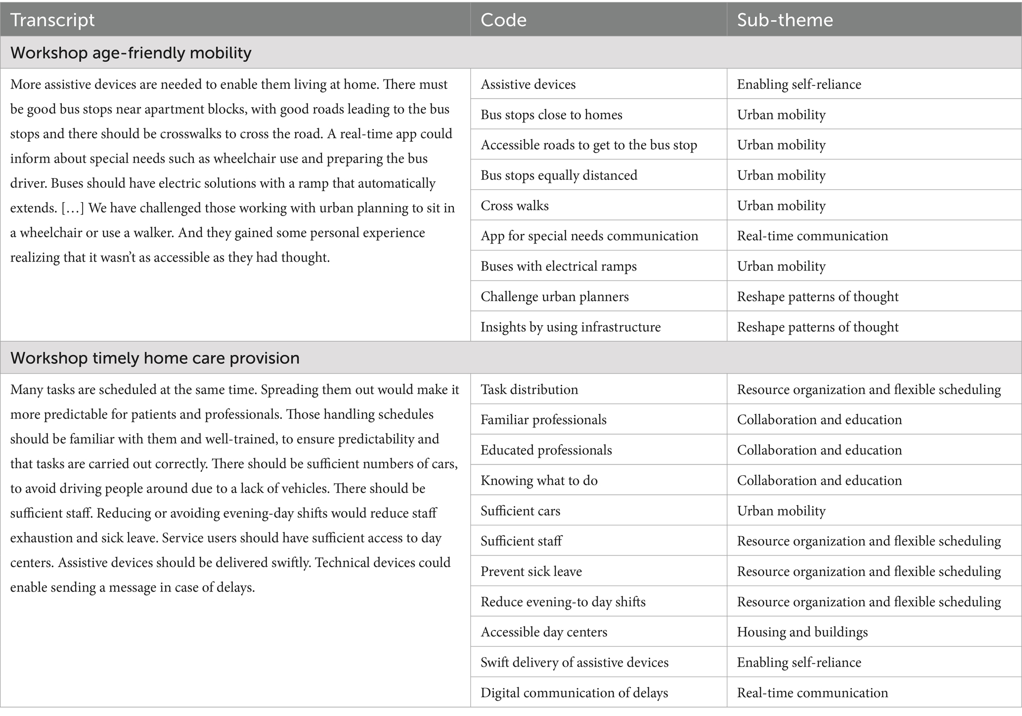 Table 2 provides an example of the inductive thematic analysis process. All three authors have considerable experience in clinical practice and qualitative data analysis. Involving all three authors, along with a professional designer, enabled multiple perspectives in the analysis and supported triangulation. The use of multiple data sources such as audio files, notes and pictures added to this (39). Triangulation, complemented by member checking, was also applied through multiple stakeholder groups assessing and validating the insights and potential design solutions for their value and feasibility during the workshops. To ensure sufficient information power (40), the initial number of workshops and participants was expanded to nine workshops involving 58 participants from diverse stakeholder groups (Table 1). Triangulation, member checking, and information power collectively strengthened the relevance and credibility of the analysis and findings (41).