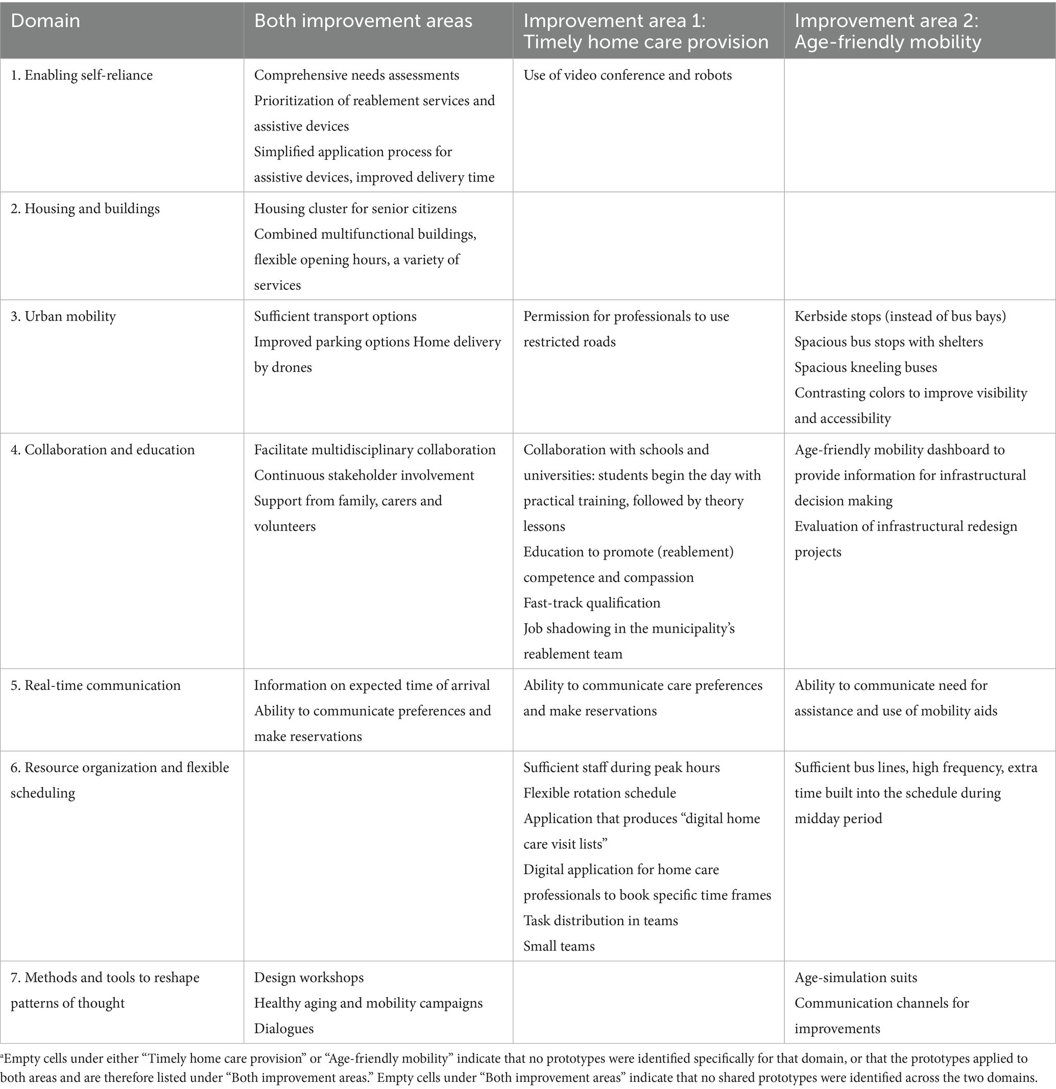 Several prototypes for the seven domains of timely home care provision and age-friendly mobility have been described in previous studies including for example reablement, improved parking options, home delivery by drones, support from family, carers and volunteers, and real-time communication (3, 42–49). However, many of these prototypes either focus on improving age-friendly mobility, have low fidelity, or address fewer domains. None of the prototypes presented in the literature were considered to represent solutions for timely home care provision. Additionally, prototypes such as kerbside stops, collaboration with schools and universities, and job shadowing within reablement teams, were unique for this study.