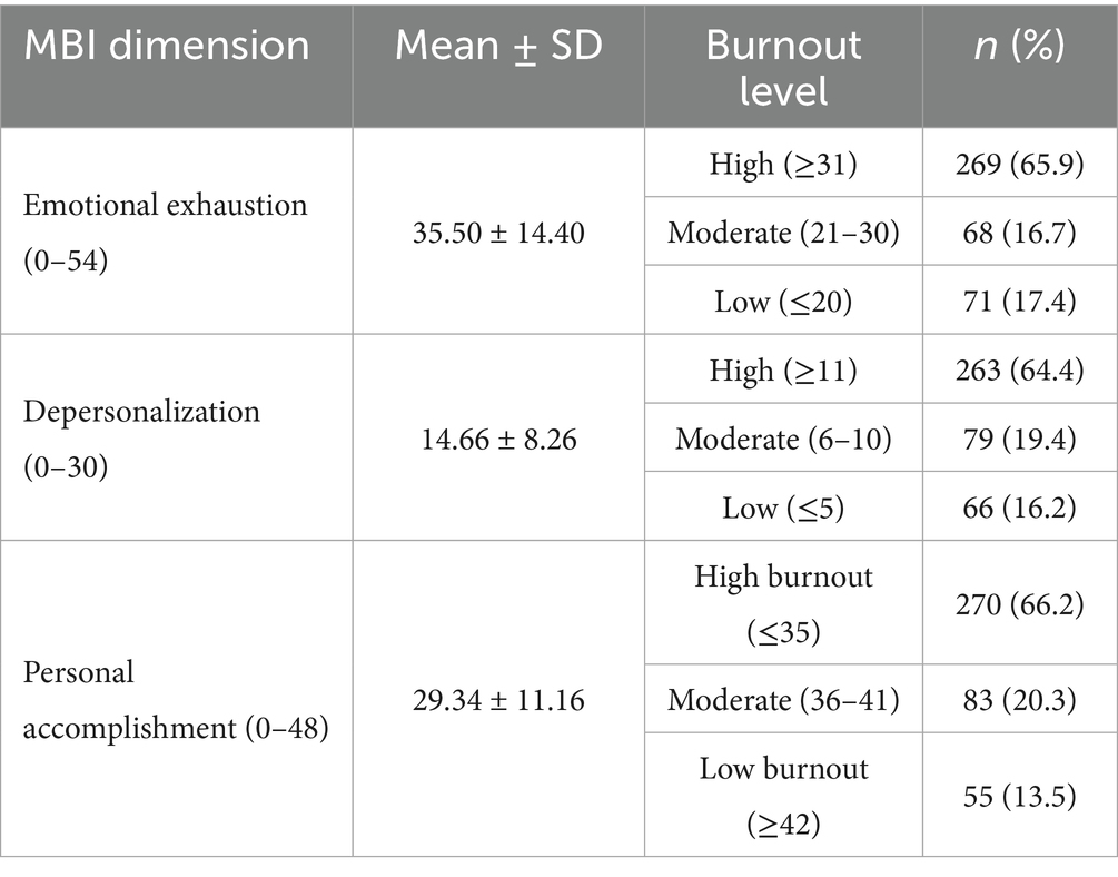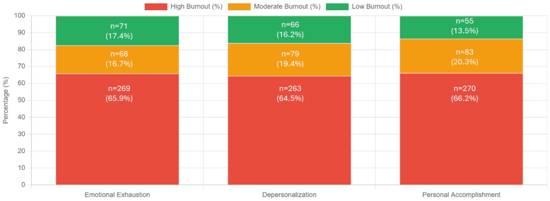 The prevalence of burnout among community pharmacists, as measured by the MBI-HSS, revealed alarmingly high rates across all three dimensions (Table 3; Figure 1). The mean scores for each burnout dimension were: EE 35.50 ± 14.40, DP 14.66 ± 8.26, and PA 29.34 ± 11.16. For EE, 269 participants (65.9%) exhibited high levels, 68 (16.7%) showed moderate levels, and only 71 (17.4%) demonstrated low levels. DP patterns were similarly concerning, with 263 participants (64.5%) showing high levels, 79 (19.4%) moderate levels, and 66 (16.2%) low levels. PA, which is inversely related to burnout (lower scores indicate higher burnout), showed that 270 participants (66.2%) had high burnout (low personal accomplishment), 83 (20.3%) had moderate levels, and only 55 (13.5%) showed low burnout (high personal accomplishment).