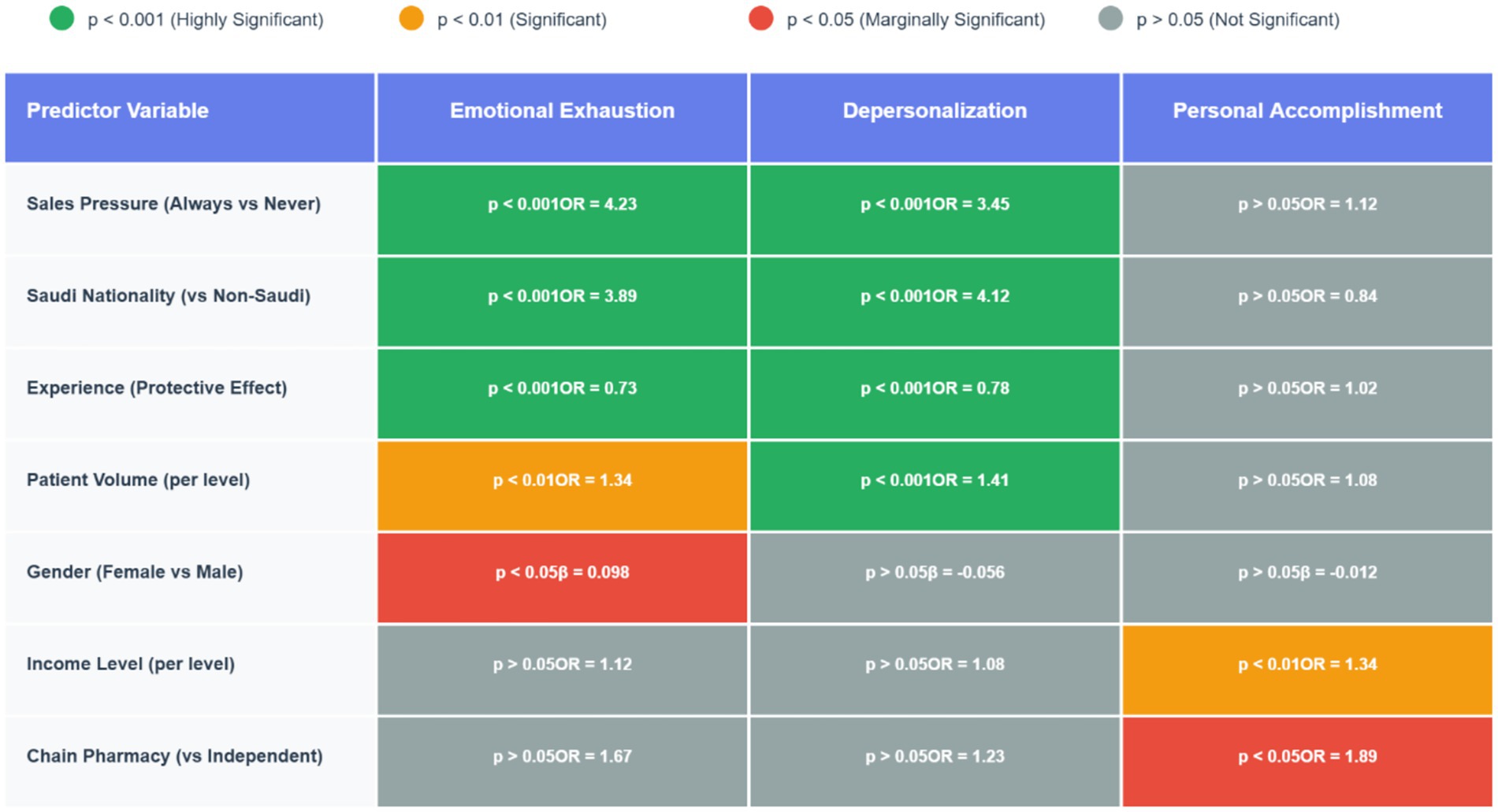 Figure 2. Significance matrix: which factors predict which burnout dimensions. Heat map table showing statistical significance levels and effect sizes (OR = Odds Ratio, β = Beta coefficient) for each predictor across the three burnout dimensions. Key Finding: notice how Personal Accomplishment (rightmost column) has a completely different pattern - only Income and Chain Pharmacy are significant, while traditional stressors (Sales Pressure, Nationality, Experience) show no effect.
