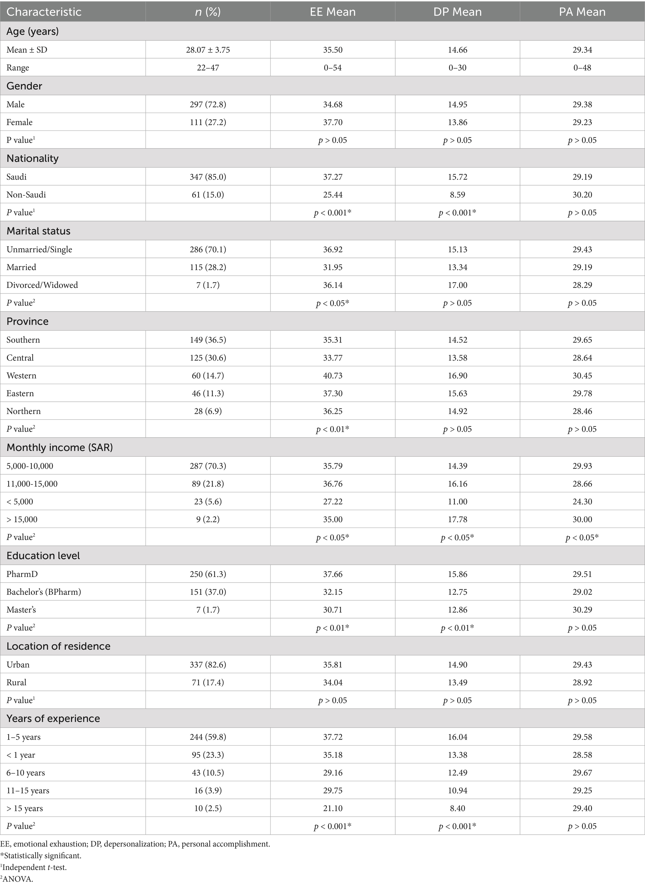 The significant association between Saudi nationality and higher burnout scores (OR = 3.89 for emotional exhaustion, OR = 4.12 for depersonalization) represents a novel finding. This nationality-based difference may reflect cultural factors, differences in educational background, or varying expectations regarding work conditions and professional roles, as noted by Al-Arifi (17) regarding cultural factors affecting pharmacy practice in Saudi Arabia. Furthermore, this association between Saudi nationality and higher levels of emotional exhaustion and depersonalization may reflect distinct cultural and workplace dynamics. Saudi pharmacists may experience greater expectations for long-term career commitment, social responsibility, and family obligations, which can intensify work-related stress (34, 35). Cultural norms may discourage open discussion of mental health struggles, potentially limiting access to coping resources (36). These factors may amplify the psychological burden of professional demands. Similar nationality-based differences have been reported by Alameddine et al. (12) among community pharmacists in Lebanon, suggesting that cultural and contextual factors significantly influence burnout development across Middle Eastern pharmacy settings.