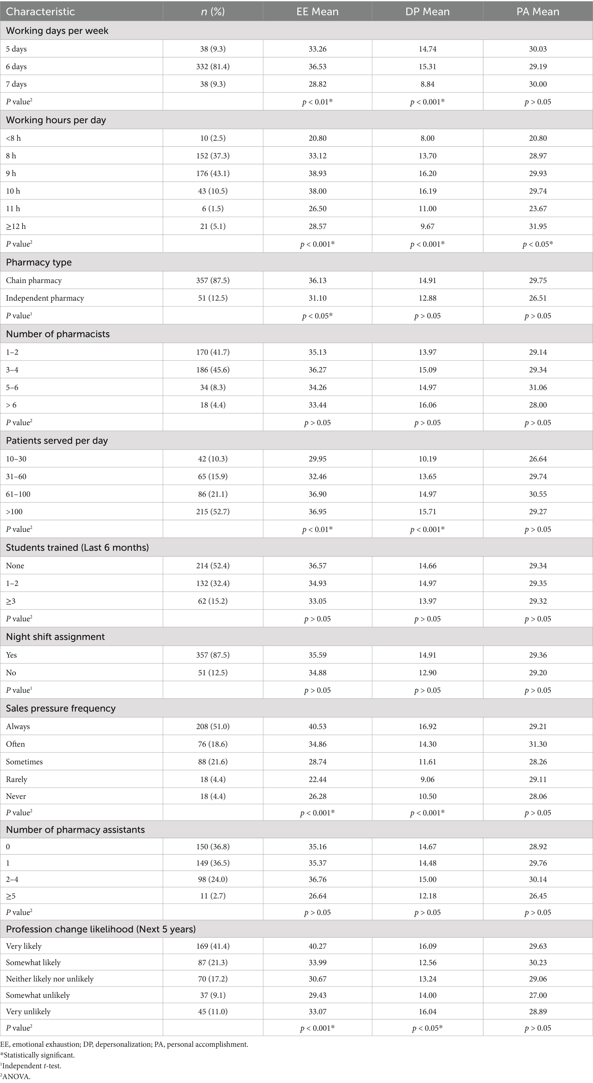 A critical finding from our study is the differential pattern of predictors across the three burnout dimensions. While sales pressure, nationality, experience, and patient volume significantly predicted emotional exhaustion and depersonalization, personal accomplishment was primarily influenced by income level (OR = 1.34) and chain pharmacy employment (OR = 1.89). This distinct pattern supports the multidimensional conceptualization of burnout proposed by Maslach and Jackson (2), suggesting that different dimensions develop through distinct pathways and respond to different workplace factors. The finding that traditional stressors showed minimal association with personal accomplishment aligns with the findings of Schindel et al. (37), indicating that interventions targeting personal accomplishment may need to focus on professional development and recognition rather than workload reduction alone.