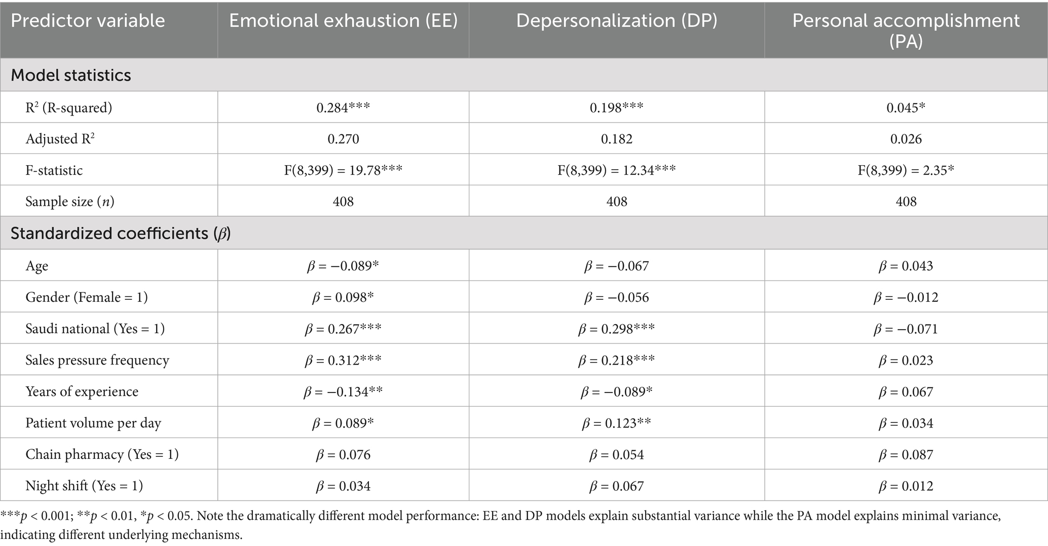 Multiple linear regression analysis was conducted to identify independent predictors of all three burnout dimensions while controlling for potential confounding variables (Table 4; Figure 2). The models included age, gender, nationality, sales pressure frequency, years of experience, patient volume, pharmacy type, and night shift assignment as predictors. The regression models demonstrated dramatically different explanatory power across dimensions: good explanatory power for emotional exhaustion [R2 = 0.284, F(8,399) = 19.78, p < 0.001], moderate explanatory power for depersonalization [R2 = 0.198, F(8,399) = 12.34, p < 0.001], and weak explanatory power for personal accomplishment [R2 = 0.045, F(8,399) = 2.35, p < 0.05].