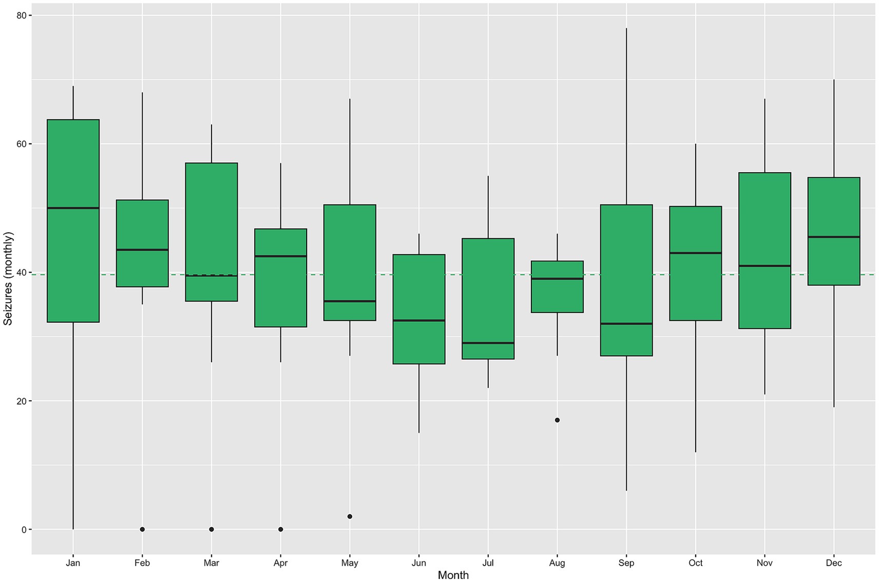 A total of 4,755 hospital emergency admissions for seizures were recorded from 2010 to 2019, representing 0.52% of all 908,003 emergency visits. Annual counts ranged from 117 to 667. The daily number of seizure-related admissions had a mean of 1.3 (median 1; range 0–11), while the monthly cumulative count had a mean of 39.6 (median 40; range 0–78). The highest median monthly admissions occurred in January (Figure 1).