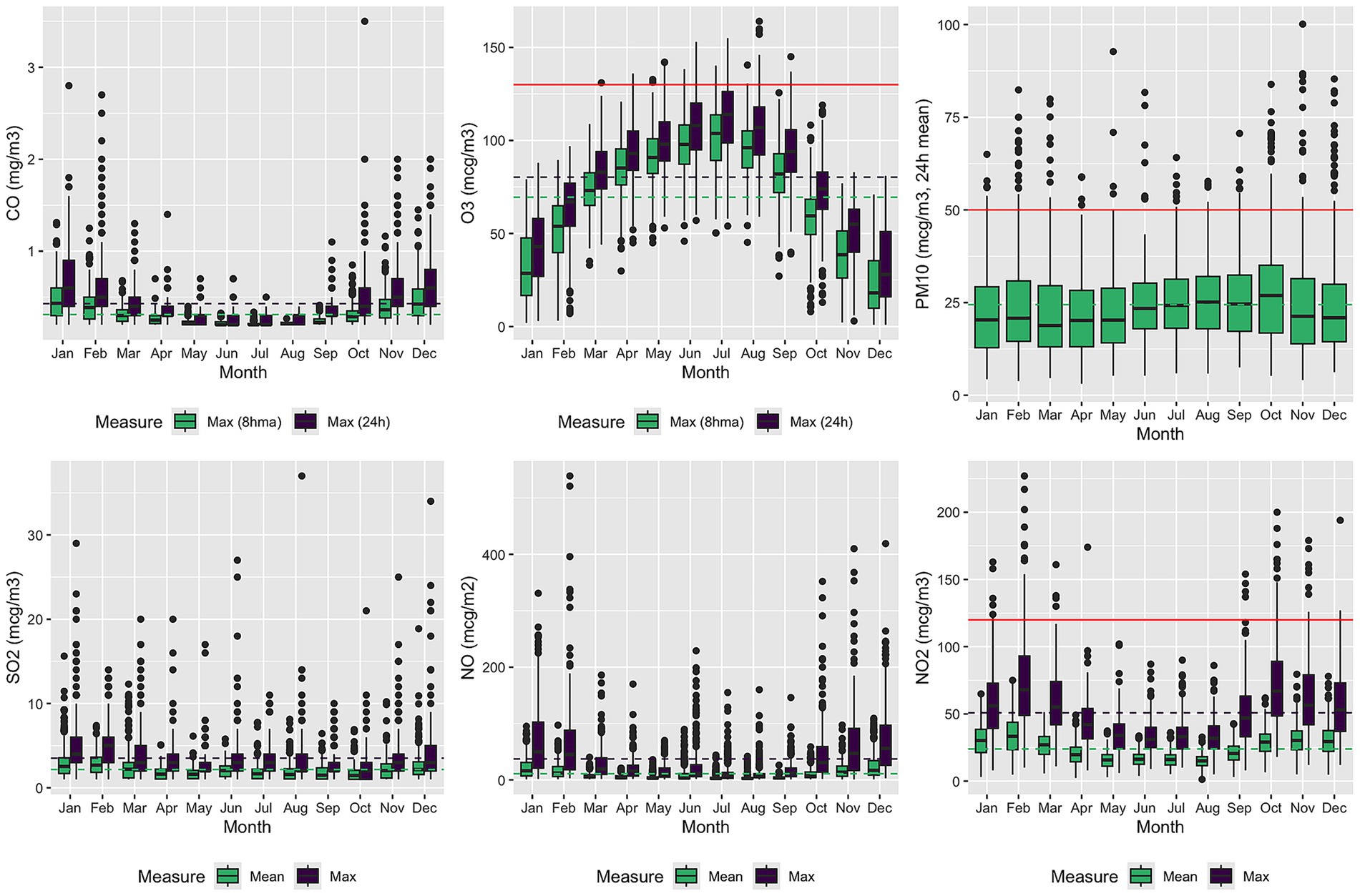 Figure 3. Distribution of daily pollution measures by month, 2010–2019. The dashed lines identify the overall mean of each measurement in the color detailed in the corresponding legend. The red lines identify poor air quality measures as those above red lines.