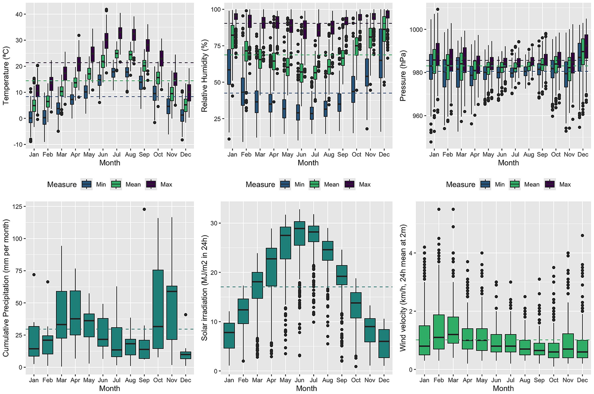 Figure 2. Distribution of daily weather measures and monthly cumulated precipitation by month, 2010–2019. The dashed lines identify the overall mean of each measurement in the color detailed in the corresponding legend.