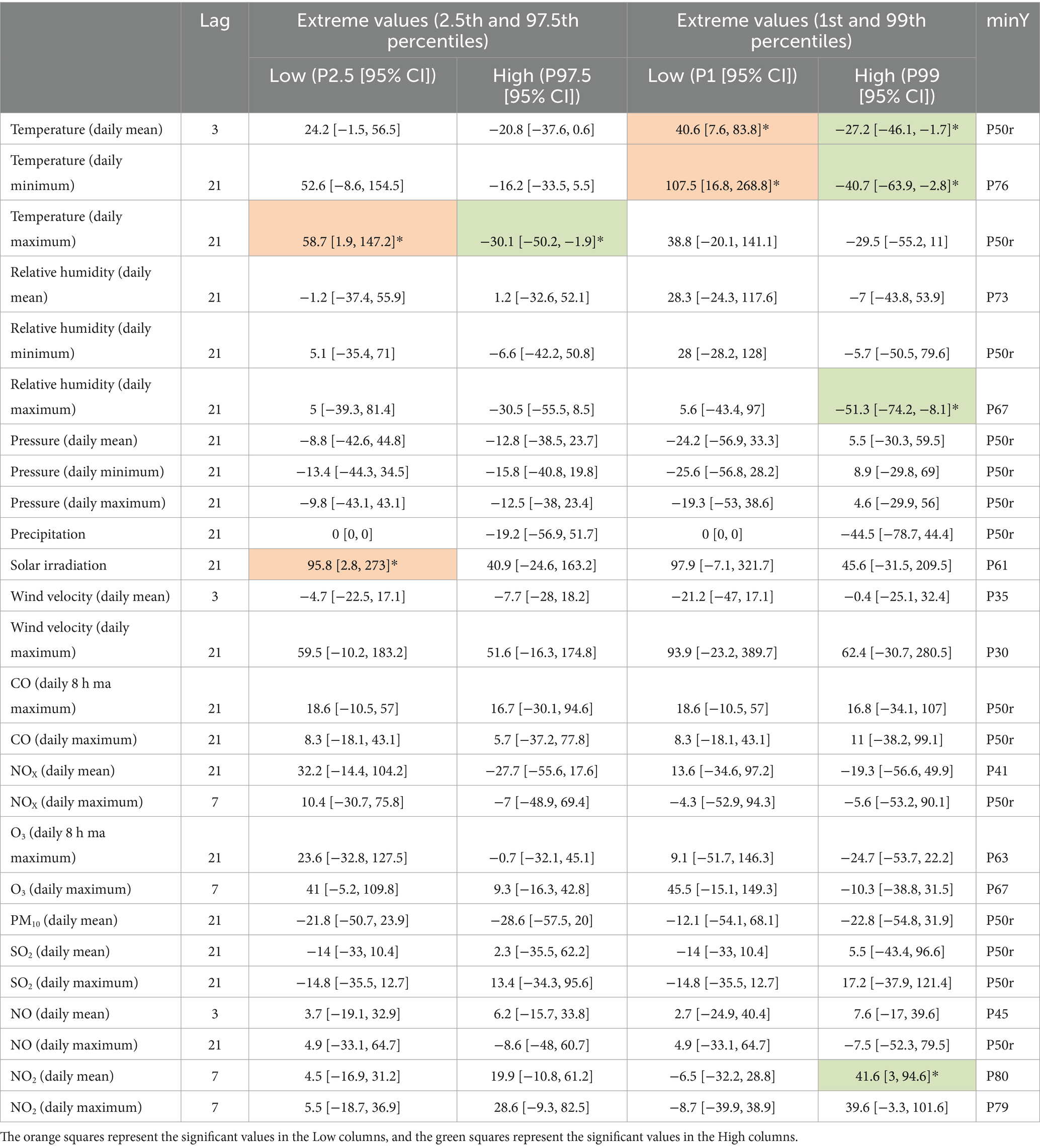 In case of significant associations with both weather and pollution variables, we used DLNM to assess if, once adjusted by the weather variable inside the model through natural splines with 4 degrees of freedom, the exposure to the pollutant keeps its significant association with hospital emergency room admissions. Although the models accounted for temporal confounders such as seasonality, long-term trends, day of the week, and public holidays, individual-level confounders (e.g., medication use, comorbidities, socioeconomic factors, or lifestyle habits) could not be included in the analysis because such information was not available in the CMBD dataset. Nevertheless, the time-series design inherently controls for stable population characteristics and slowly varying individual factors, reducing the likelihood of major confounding bias.