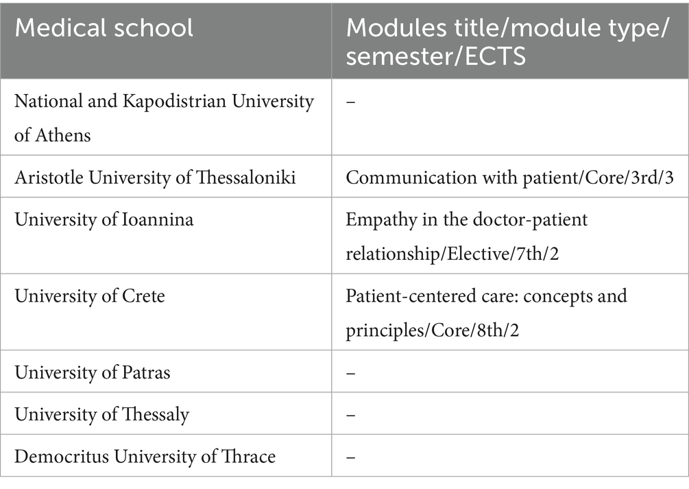 However, the findings in Table 1 suggest that formalized communication training remains limited within Greek medical curricula. Only three of the seven operating medical schools offer a dedicated module on communication, and among these, only two are designated as core modules, indicating that most students are not guaranteed structured exposure to these essential skills. Furthermore, the allocated ECTS for these modules is minimal. For example, a three ECTS module represents only 0.83% of a typical 360 ECTS medical program, highlighting that communication constitutes a very small proportion of the overall curriculum. While dedicated modules are scarce, it is plausible that communication competencies are embedded within other mandatory courses, such as “Medical Psychology.” However, without a standardized, explicit focus, the delivery and depth of this training remain inconsistent and are difficult to assess.