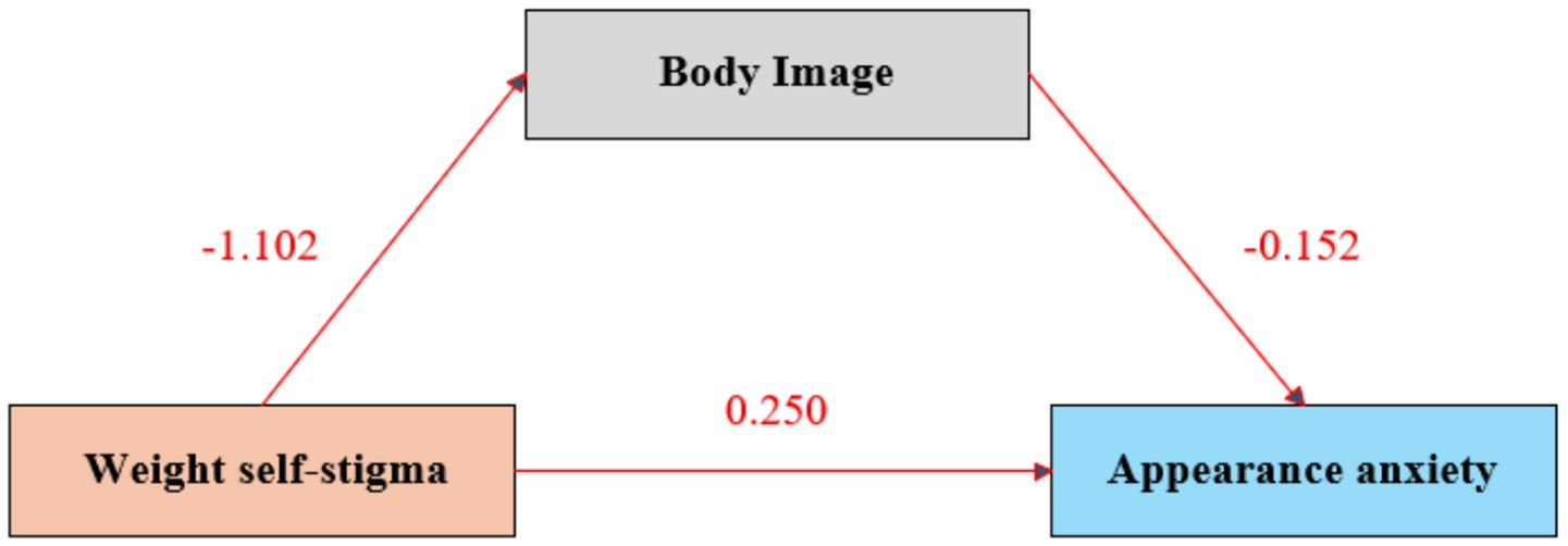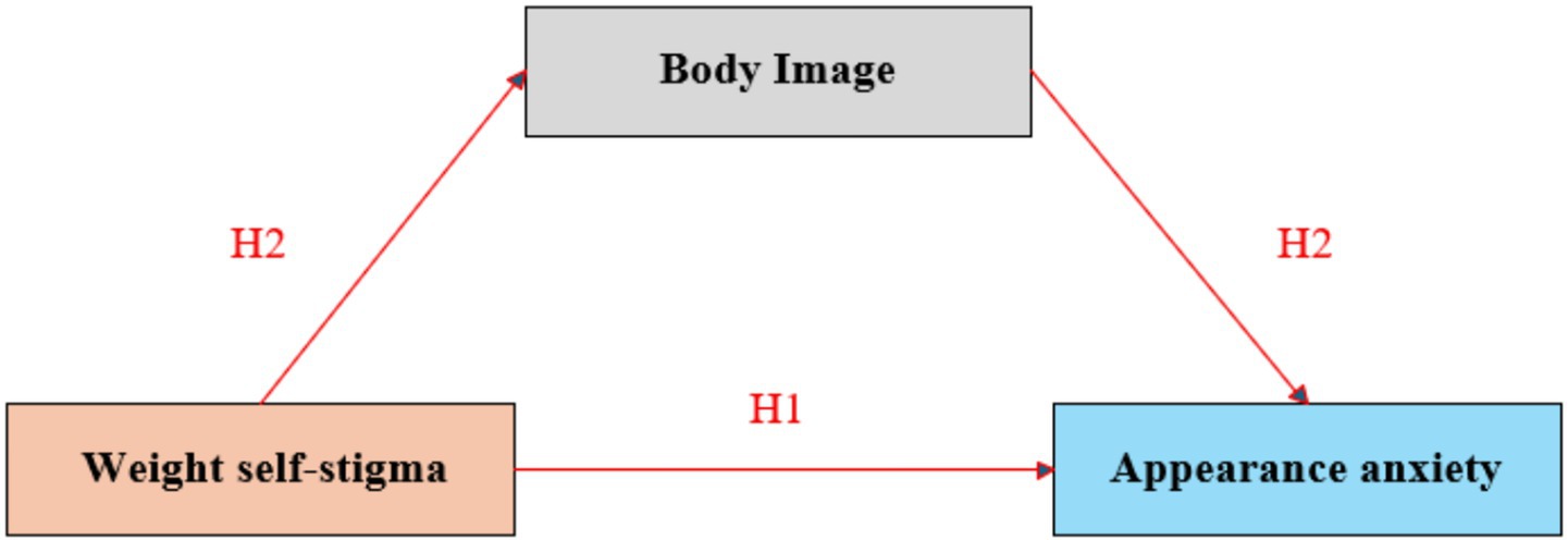 Within the domain of weight self-stigma, sociocultural theory emphasizes that cultural prescriptions, such as the ideology of “thinness as beauty,” foster negative social stigma surrounding weight (39). Through internalization, this stigma leads to self-objectification, in which individuals begin to regard their bodies as objects for others’ observation and evaluation. Such a self-objectifying perspective distorts one’s perception and evaluation of the body (15), undermines positive body image, and heightens preoccupation with perceived appearance flaws, directly contributing to increased appearance anxiety (40). Self-discrepancy theory further elucidates that weight self-stigma often co-occurs with cognitive biases, whereby individuals attribute weight-related concerns or failure to achieve an ideal body shape to personal moral shortcomings (41). This moralization of weight engenders intense feelings of shame and self-criticism, thereby diminishing satisfaction with Body Image (42, 43). Persistent dissatisfaction and negative evaluations of the body constitute core experiential components of appearance anxiety (44). Research demonstrates that improving body image effectively alleviates weight self-stigma, underscoring its mediating function within the pathological mechanism (45). For example, one study found that individuals with higher body mass index (BMI) often exhibit negative body image and weight self-stigma (46). Moreover, satisfaction with body image is negatively associated with weight self-stigma, and interventions targeting body image improvement can mitigate weight self-stigma (47). Therefore, this study proposes Hypothesis 2 (H2): body image mediates the relationship between weight self-stigma and appearance anxiety among female college students.
