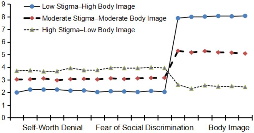 This study identified three distinct patterns of association between weight self-stigma and body image: Low Stigma–High Body Image, Moderate Stigma–Moderate Body Image, and High Stigma–Low Body Image. The distribution of these classes differed from that reported in previous research (75). One possible explanation for this discrepancy lies in the fact that prior studies have primarily focused on the linear relationships between weight stigma and negative psychological indicators such as anxiety and depression (76). By introducing body image as a positive variable, the present study uncovered an asymmetry between weight stigma and body-related cognition—namely, some individuals, despite experiencing weight stigma, may still maintain a relatively positive body image through social support, body functionality recognition, or the adoption of diversified aesthetic standards (77). For instance, certain female university students, though subject to social pressure regarding weight, may redefine the value of their bodies through activities such as dance or fitness, resulting in a paradoxical state of “stigma exists but body image remains high (78).”