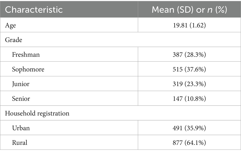 Before the formal survey, investigators received standardized training and conducted a pilot study with a small sample to confirm that the Cronbach’s α coefficients of the scales exceeded 0.70. Only after this validation was the large-scale survey carried out. Before completing the questionnaire, participants were informed about the study’s purpose, significance, and procedures and provided informed consent. The survey was supervised jointly by class counselors and trained research assistants. Upon completion, all questionnaires were checked, verified, and cross-examined; incomplete or missing items were supplemented or excluded to ensure data integrity and reliability. The questionnaires were distributed via the online platform Wenjuanxing, promoted through student unions, counselors, and social media groups. A total of 1,500 questionnaires were distributed, and 1,426 valid responses were returned (response rate = 95%). After excluding patterned responses and questionnaires with more than 10% missing items, 1,368 valid samples were retained for analysis (validity rate = 96%). Demographic characteristics of the participants were as follows: the mean age was 19.81 years (SD = 1.62), with 37.6% sophomores, 28.3% freshmen, 23.3% juniors, and 10.8% seniors. Regarding household registration, 64.1% of participants were from rural areas, while 35.9% were from urban areas (see Table 1).