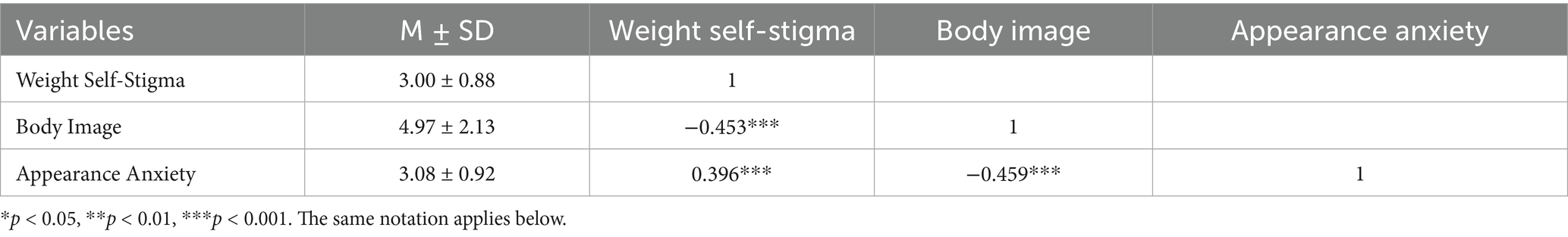 Correlation analyses were conducted on the mean scores of weight self-stigma, body image, and appearance anxiety. The results indicated that weight self-stigma was positively correlated with appearance anxiety, while body image was negatively correlated with both weight self-stigma and appearance anxiety (see Table 2).