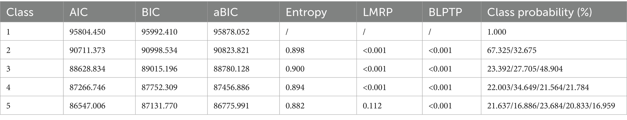 Descriptive statistics, correlation analyses, and multiple logistic regression analyses were conducted using SPSS 27.0. Mediation analysis was performed using the SPSS 27.0 macro PROCESS (Model 4). Confirmatory factor analysis and latent profile analysis were conducted using Mplus 8.3. Model fit was evaluated through multiple indices, including AIC, BIC, adjusted BIC (aBIC), entropy, the Lo–Mendell–Rubin likelihood ratio test (LMRT), and the bootstrap likelihood ratio test (BLRT). Lower values of AIC, BIC, and aBIC indicated better model fit, while entropy values closer to 1 reflected higher classification accuracy. Significant p-values (< 0.05) for LMRT and BLRT suggested that the K-class model outperformed the K–1 class model. To avoid unnecessary model segmentation, a minimum class probability of 5% was set (57).