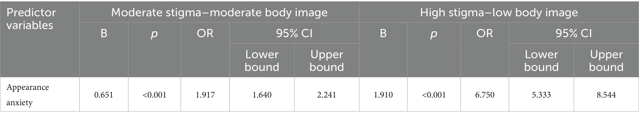 To further examine the relationship between the three latent classes and appearance anxiety, multinomial logistic regression was performed with the three categories as dependent variables, using the Low Stigma–High Body Image group as the reference category. The results indicated that different profiles of weight self-stigma and body image were significantly associated with appearance anxiety (p < 0.001) (Table 5).