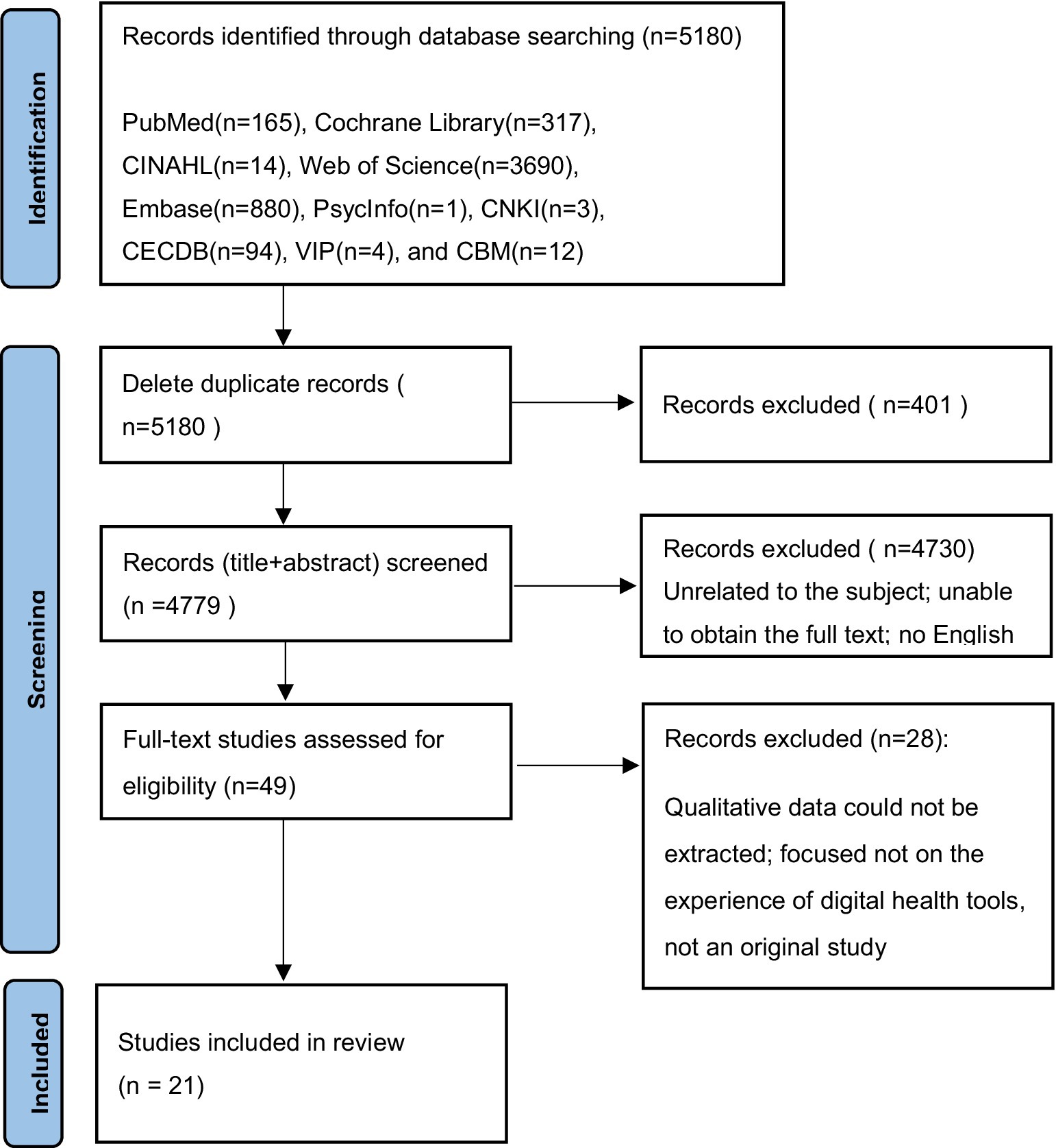 Two researchers independently screened and extracted the literature according to the inclusion and exclusion criteria. An initial search using the above strategy yielded a total of 5,180 articles. First, the titles and abstracts of the articles were read to exclude those unrelated to the subject, were repetitive, and full text could not be obtained. Subsequently, 5,131 articles were excluded. After reading the full texts, 28 articles were excluded, and finally, 21 articles were identified as relevant. Also, no articles were traced from references. This search process is illustrated in Figure 1.
