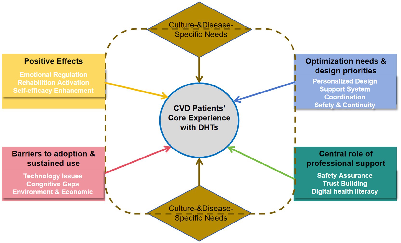 Conclusion: Cardiovascular DHTs should be grounded in patients’ individualized needs and operationalized through age-friendly technological innovations, integration of professional support, and culturally sensitive design. Leveraging multiple pathways and modalities to strengthen the family–hospital–community support system will improve the acceptability of DHTs among people with cardiovascular disease. What this review uniquely adds is the patient-reported affective/relational value (e.g., feeling “continuously accompanied,” increased reassurance and trust through human-in-the-loop supervision) and the contextual value of digital health (age-friendly, culturally and disease-specific tailoring integrated with family/clinician support).