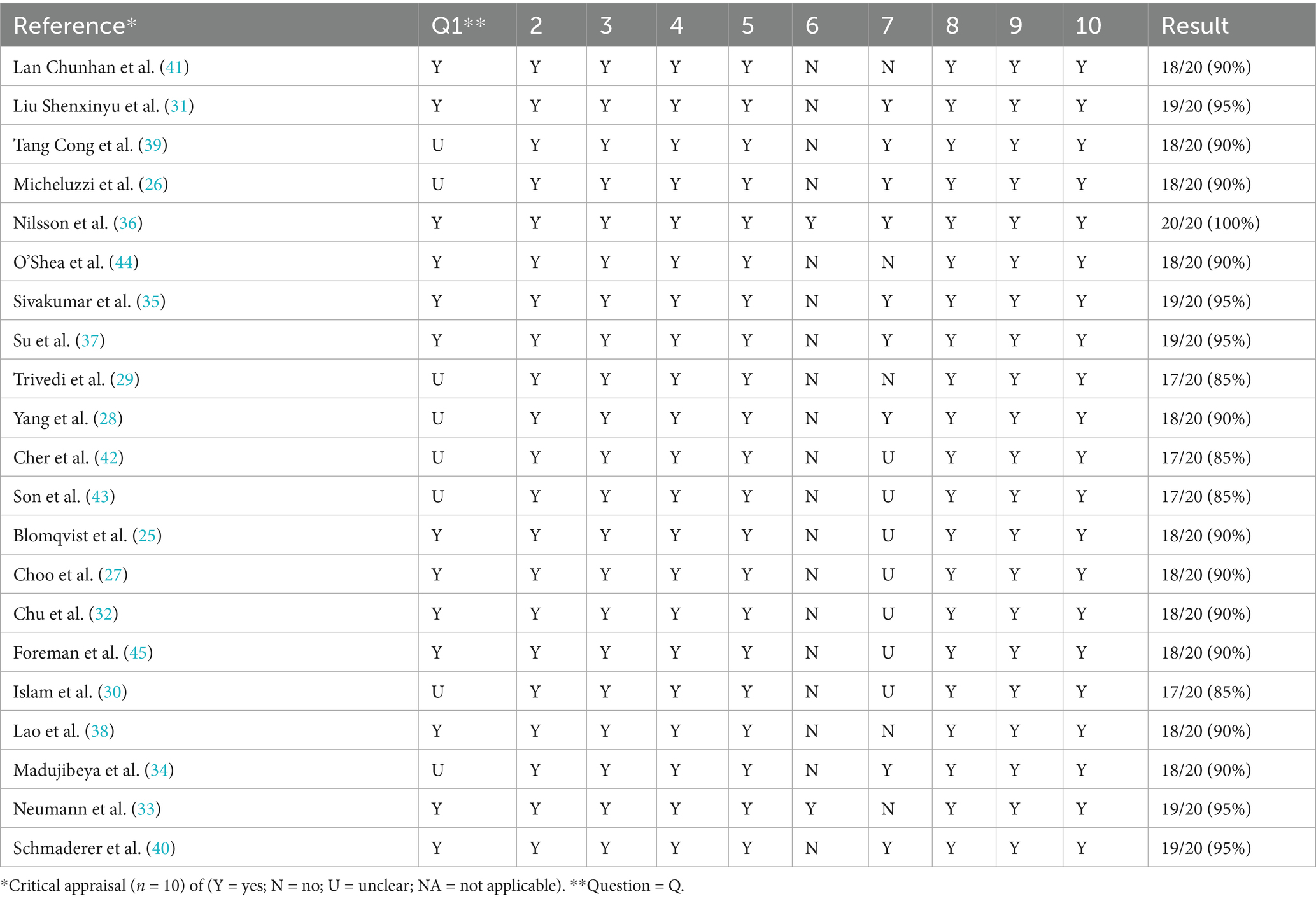 Two researchers independently assessed the methodological quality of the 21 included studies. Initially, the authors worked independently using the Joanna Briggs Critical Assessment Tool for Methodological Quality Assessment (22). This evaluation tool is widely applicable in the appraisal of qualitative research. The quality appraisal of research mainly focuses on the internal authenticity of the research, that is, the degree to which the research results are close to the true value, in order to determine whether there is bias. The evaluation tool consists of 10 questions designed to quickly and efficiently evaluate the studies with a simple yes, no, or unclear to each question. Each criterion was allocated a score (Yes = 2, No = 0, Unclear = l), giving a total score of 20 for each study. These scores were then converted to a percentage. Subsequently, the results were discussed to reach a consensus, studies with a score of more than 70% were considered acceptable after quality appraisal, otherwise they were excluded.