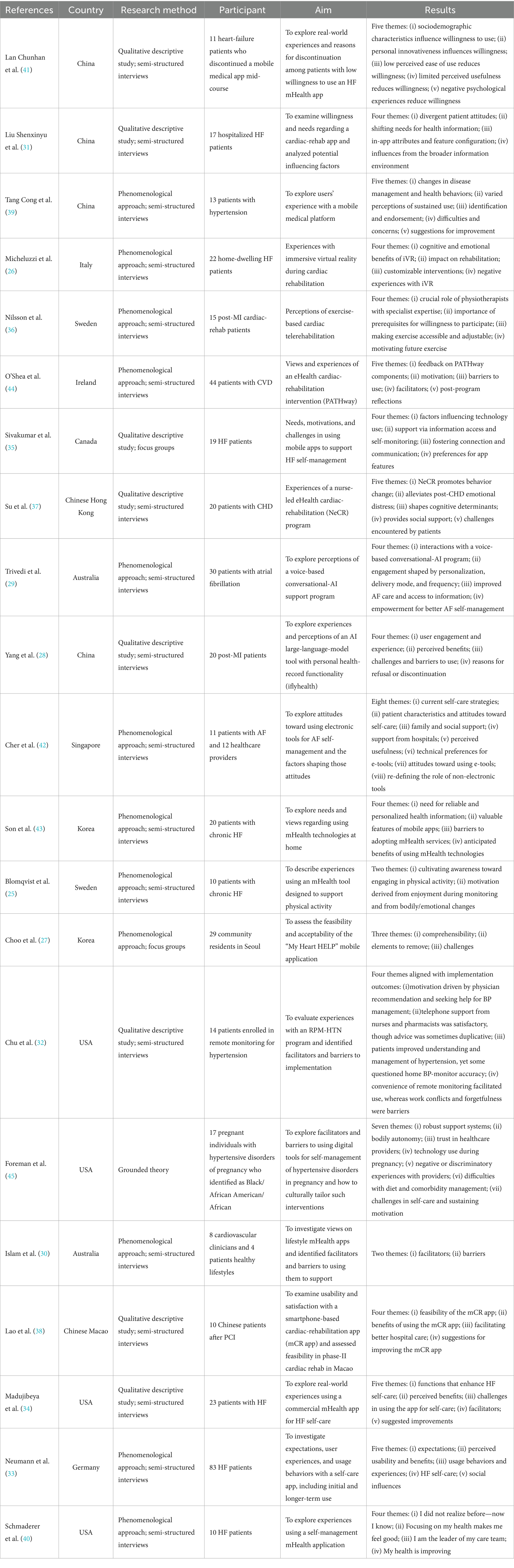 Against this backdrop, digital health tools (DHTs) are a pivotal pathway for optimizing patient management and reducing inequities in resource distribution and access to care. Representative tools—telerehabilitation, mobile health (mHealth) applications, and wearable devices—offer several advantages: continuous remote monitoring, enhanced self-management, strengthened clinician–patient collaboration, and potential gains in cost and efficiency. They show particular promise for improving access and continuity of care in primary care and resource-limited settings (6). Growing evidence (7–9) shows that DHTs improve process indicators such as medication adherence, self-monitoring frequency, and appointment attendance in secondary prevention. These tools have also been shown to improve clinical outcomes like blood pressure control and lipid management. For example, mHealth strategies using interactive voice response (IVR) and text messaging strengthen risk-factor management, facilitate blood-pressure and lipid control, and reduce heart-failure readmissions (10, 11). Wearable devices (e.g., smartwatches, ECG patches) support continuous rhythm surveillance and report positive predictive values of 84–98% for detecting atrial fibrillation, enabling earlier detection and intervention (12). Relevant qualitative study (13) further indicate that patients’ experiences include a sense of being “continuously accompanied” and emotionally supported, as well as identity affirmation, relational trust, informational transparency, perceived privacy, and burden. However, while several studies have explored the impact of DHTs, there is a lack of cross-study synthesis that clarifies how patients experience these tools, why they adopt or resist them, and under what conditions they are effective. Existing qualitative syntheses (14) have examined barriers and facilitators in cardiac rehabilitation, but there is still a gap in understanding the holistic experience of cardiovascular patients with DHTs, particularly in varied settings and across diverse patient populations.