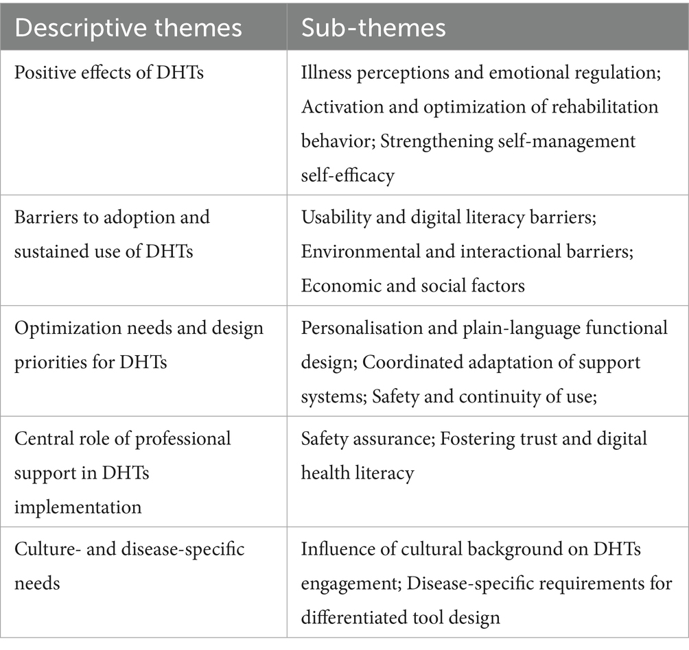 Results: A total of 21 studies were included; 92 findings were extracted, organized into 13 categories, and consolidated into five synthesized findings: positive effects of DHTs; barriers to adoption and sustained use of DHTs; optimization needs and design priorities for DHTs; and culture- and disease-specific needs.