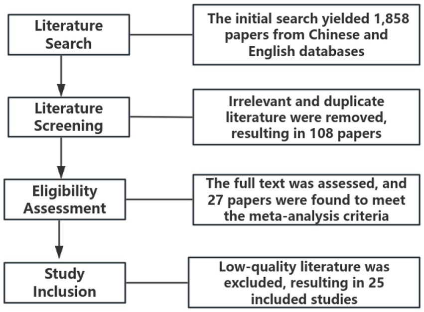 During the final inclusion stage, two studies with evident methodological or quality issues were excluded. After completing the four-step process of identification, screening, eligibility assessment, and inclusion, a total of 25 studies met the criteria for meta-analysis. Among these, 22 were published in English and 3 in Chinese, involving a combined independent sample of 1,485 participants. The included studies were conducted across seven countries: China (7 papers), Australia (6 papers), the United States (4 papers), Spain (4 papers), Slovenia (2 papers), Canada (1 papers), and Italy (1 papers).