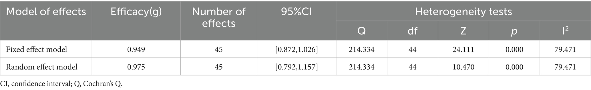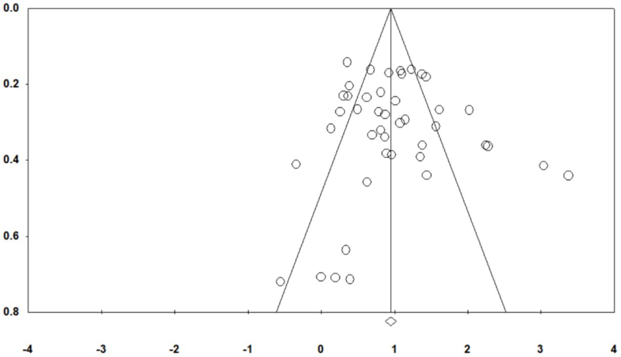 First, the funnel plot (Figure 2) showed an approximately symmetrical distribution of effect sizes, suggesting a low risk of publication bias. Second, Egger’s linear regression test was not significant (p = 0.77967 > 0.05), further indicating that the sample was unlikely affected by publication bias. Finally, the Fail-Safe N was 5,833, far exceeding the criterion of 5n + 10 = 235. Based on these results, there is sufficient evidence to conclude that publication bias is unlikely in this study, and the estimated effect sizes are robust and reliable.
