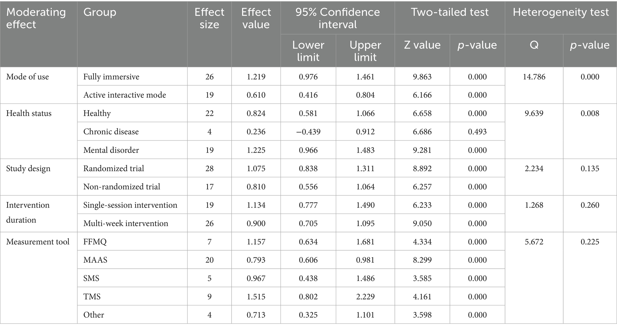 The moderating effect of usage mode was significant. Subgroup analysis indicated that the effect of VR on enhancing mindfulness varied depending on the usage mode (Q = 14.786, p < 0.05). The fully immersive group showed a higher effect size (g = 1.219) compared to the active-interaction group (g = 0.610), suggesting that, relative to an active-interaction mode, a fully immersive usage mode produces a stronger enhancement of mindfulness levels.