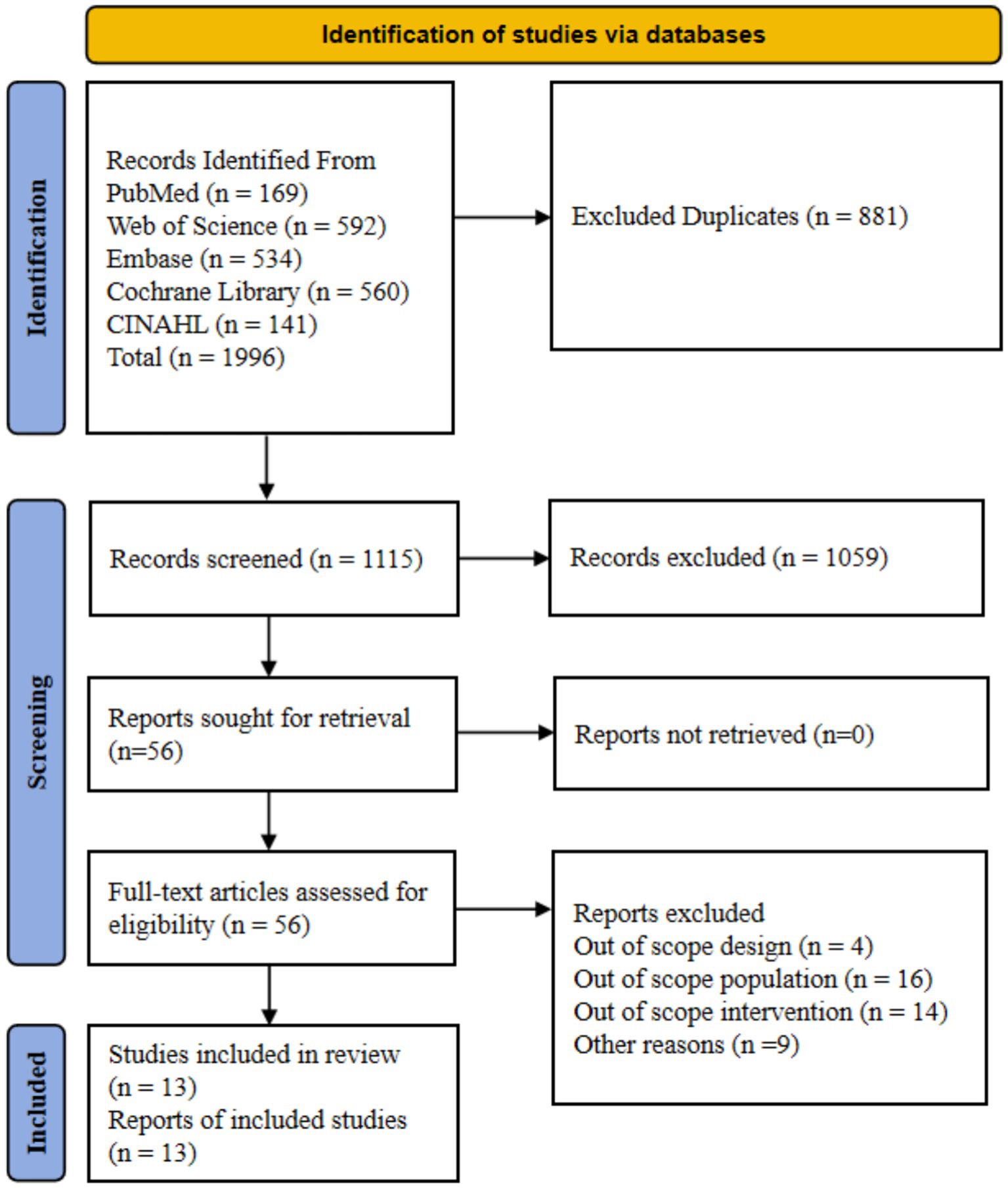 The systematic search across PubMed, Web of Science, Embase, the Cochrane Library, and CINAHL initially yielded 1,996 records. After the removal of 881 duplicates, the titles and abstracts of the remaining 1,115 records were screened. From this, 1,059 records were excluded as they were thematically irrelevant, were not randomized controlled trials, or were not published in English. The full texts of the remaining 56 articles were retrieved and assessed for eligibility. Of these, 43 articles were subsequently excluded for reasons including non-conforming study design (n = 4), population (n = 16), intervention (n = 14), or other reasons (n = 9). Ultimately, 13 studies fulfilled all inclusion criteria and were included in the final systematic review and meta-analysis. The complete study selection process is illustrated in the PRISMA flow diagram (Figure 1).