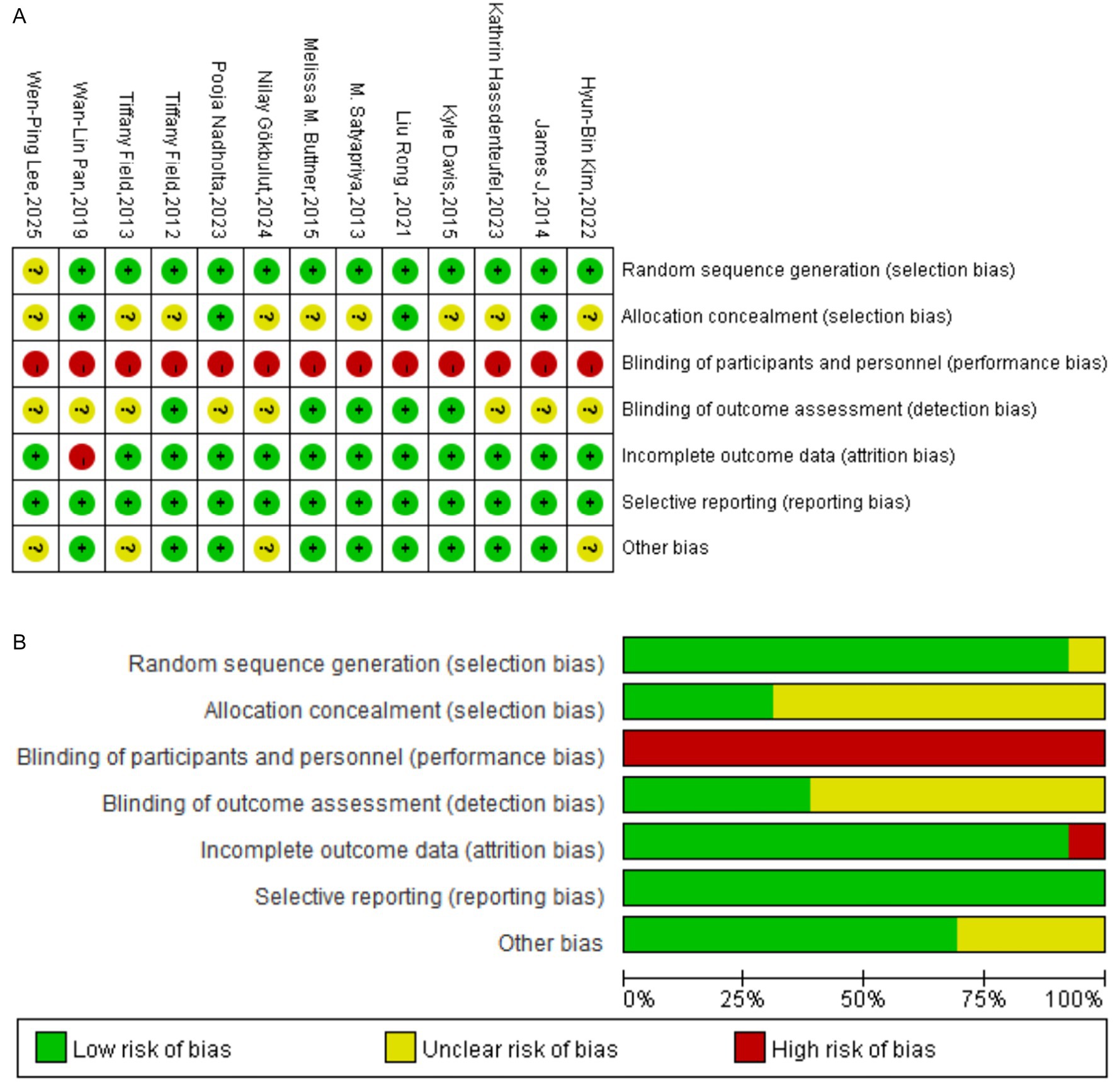 The methodological quality of the 13 included RCTs was assessed using the Cochrane risk-of-bias tool, with results summarized in Figures 2A,B. The assessment revealed the following: for random sequence generation, all 13 studies were rated at low risk of bias. For allocation concealment, four studies were at low risk, while nine were at unclear risk. A high risk of performance bias was evident across all studies due to the inherent difficulty of blinding participants and personnel to a mind–body intervention. For detection bias (blinding of outcome assessment), five studies were at low risk, and eight were at unclear risk. Regarding attrition bias (incomplete outcome data), 12 studies were at low risk, and one was at high risk. All studies were judged to be at low risk of reporting bias. For other potential sources of bias, nine studies were at low risk, and four were at unclear risk. Overall, the methodological quality of the included studies was deemed moderate. However, significant limitations were identified, stemming primarily from an unclear risk of bias for allocation concealment in the majority of studies (n = 9), a high risk of performance bias due to the lack of participant and personnel blinding (n = 13), and an unclear risk of detection bias in outcome assessment (n = 8). While blinding is challenging in trials of behavioral interventions, these limitations may nonetheless compromise the reliability of the findings.