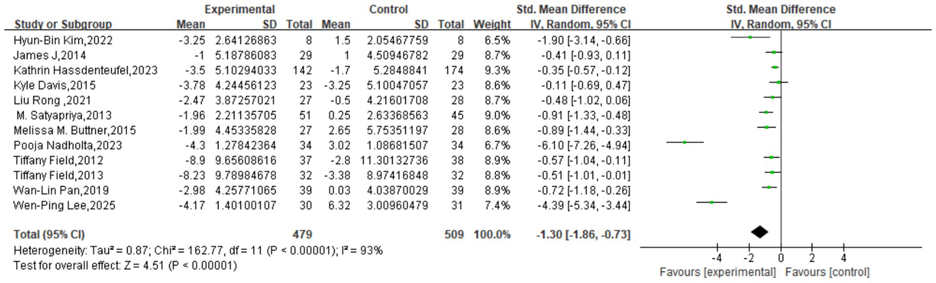 The meta-analysis, incorporating 12 studies with a total of 988 participants, revealed a significant, large effect of mind–body interventions on depressive symptoms. The pooled effect size was an SMD of −1.30 (95% CI: −1.86 to −0.73, p < 0.00001), indicating a statistically significant advantage for the intervention group over the control group. However, a very high degree of heterogeneity was observed across the studies (I2 = 93%), suggesting substantial variation in effect sizes. This variability may be attributable to differences in population characteristics, intervention protocols, measurement tools, or study quality, warranting a cautious interpretation of the pooled estimate (Figure 3).