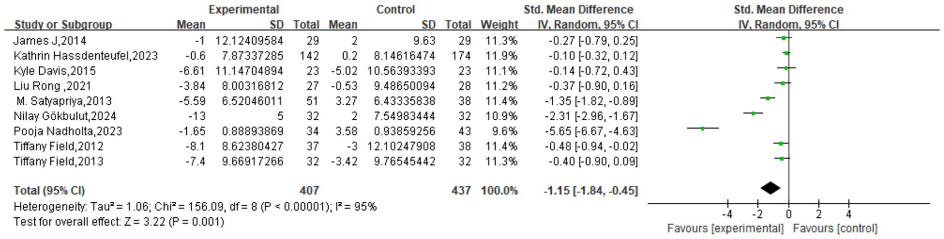 Similarly, the meta-analysis of anxiety outcomes, which included 9 studies with 844 participants, demonstrated a significant, large effect in favor of the intervention. The pooled effect size was an SMD of −1.15 (95% CI: −1.84 to −0.45, p = 0.001). As with the depression outcome, very high heterogeneity was present (I2 = 95%). This substantial variability likely stems from a combination of factors, including differences in study design, participant characteristics, intervention modalities, assessment tools, and implementation settings. Consequently, further investigation through subgroup and sensitivity analyses is necessary to explore the sources of heterogeneity and to confirm the robustness of this finding (Figure 4).