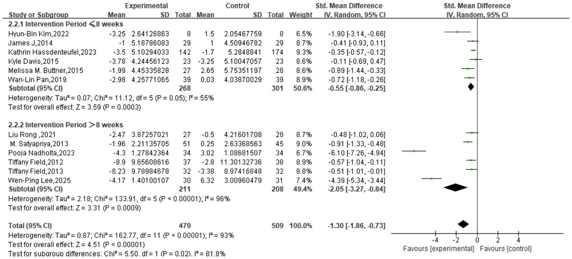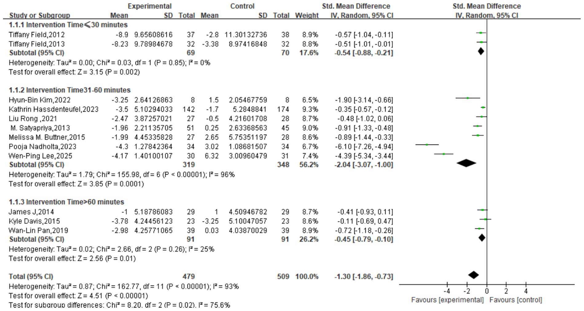 For the depression outcome, subgroup analysis based on session length revealed a statistically significant difference between subgroups (χ2 = 8.29, p = 0.02, I2 = 75.9%). All three subgroups demonstrated significant intervention effects: the short-duration group (≤30 min) yielded a pooled SMD of −0.54 (95% CI: −0.88, −0.21; p = 0.002) with no heterogeneity (I2 = 0%); the moderate-duration group (31–60 min) had a pooled SMD of −1.86 (95% CI: −2.76, −0.95; p < 0.0001) with very high heterogeneity (I2 = 96%); and the long-duration group (>60 min) showed a pooled SMD of −0.45 (95% CI: −0.79, −0.10; p = 0.01) with low heterogeneity (I2 = 25%) (Figure 5).