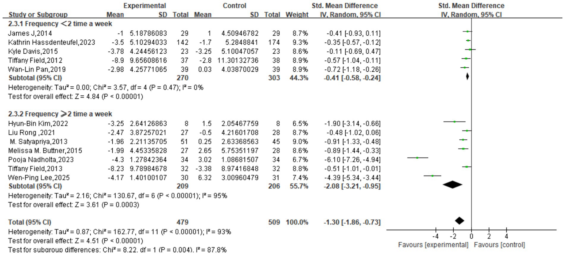 Similarly, analysis based on intervention frequency indicated a significant difference between subgroups (χ2 = 8.22, df = 1, p = 0.004, I2 = 87.8%). The group with a frequency of <2 sessions/week had a pooled SMD of −0.41 (95% CI: −0.58, −0.24) with low heterogeneity (I2 = 0%; p < 0.00001). The group with ≥2 sessions/week showed a much larger effect with a pooled SMD of −2.08 (95% CI: −3.21, −0.95), though with very high heterogeneity (I2 = 95%; p = 0.0003). This indicates that intervention frequency is also a significant moderator of the effect on depression (Figure 7).