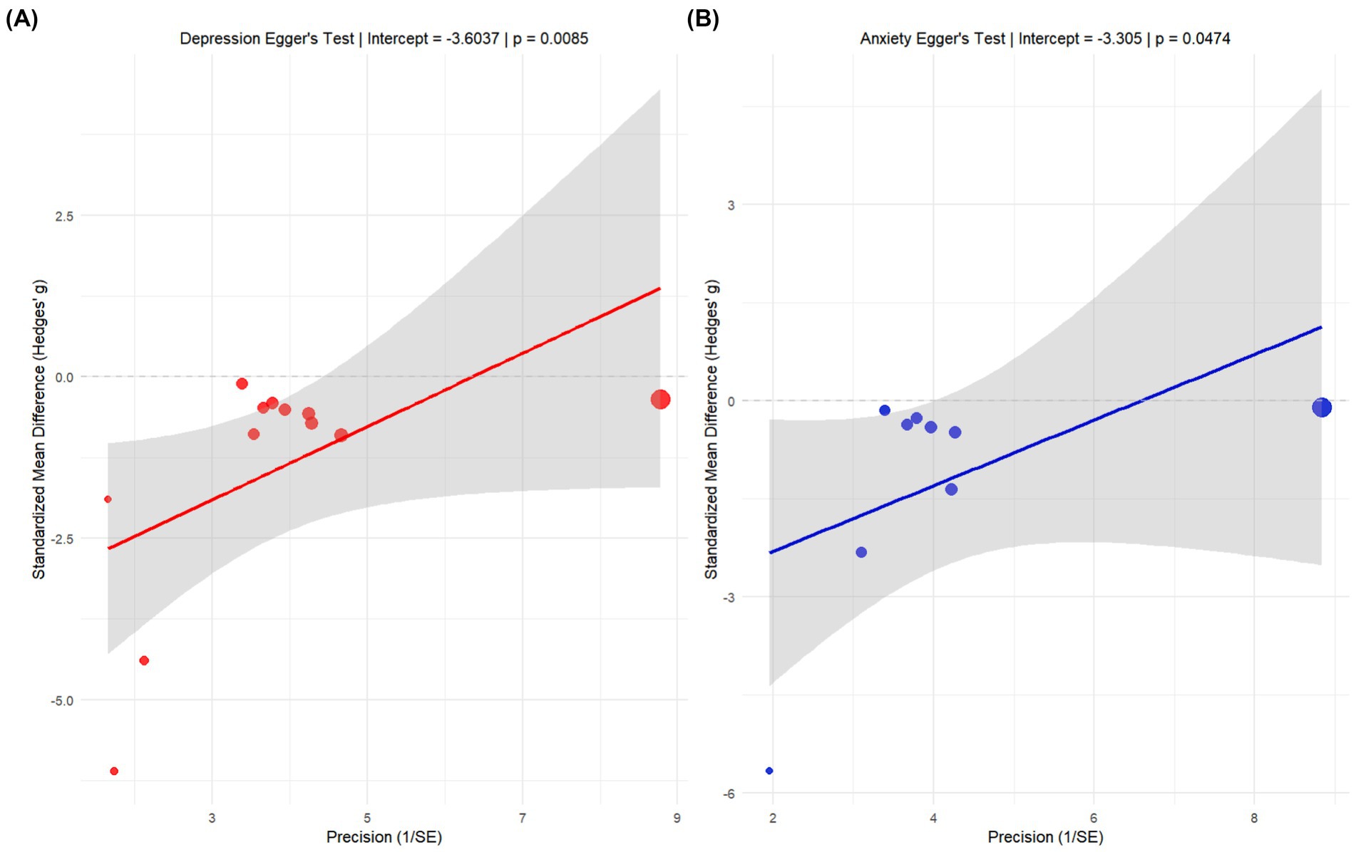 Figure 8. Egger test publication bias analysis chart. (A) Egger’s test for studies on depression (intercept = −3.6037, p = 0.0083). (B) Egger’s test for studies on anxiety (intercept = −3.305, p = 0.0474). The y-axis represents the standardized effect size (standardized mean difference/SE), and the x-axis represents precision (1/SE). Solid circles represent individual studies, the solid line is the weighted regression line, and the shaded area is the 95% confidence interval. The significant deviation of the regression line from zero in both analyses suggests potential publication bias.