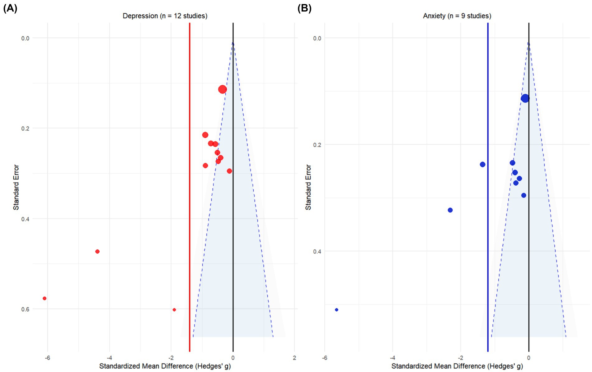 To further investigate the potential impact of publication bias, a sensitivity analysis was conducted using the trim and fill method. This analysis did not identify any missing studies to be imputed for either the depression or the anxiety outcomes (number of imputed studies = 0 for both). This result suggests that while Egger’s test detected asymmetry, it was not substantial enough to warrant adjustment of the pooled effect size by imputing hypothetical studies. The funnel plots generated by the trim and fill method showed that the observed studies were distributed relatively symmetrically around the pooled effect estimate. The discrepancy between the Egger’s test and trim and fill results may arise because the latter has a higher threshold for detecting bias, or because the observed asymmetry is a product of true between-study heterogeneity rather than publication bias. Taken together, while the possibility of publication bias cannot be entirely dismissed, its substantive impact on the overall results of this meta-analysis is likely limited (Figure 9).