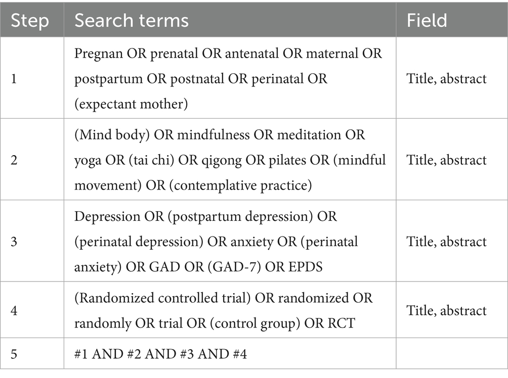To identify relevant studies evaluating the effectiveness of mind–body exercise on perinatal mental health outcomes, we conducted a systematic search of the following electronic databases: Cochrane Library, PubMed, Embase, Web of Science, and CINAHL. The search covered the period from the inception of each database to September 1, 2025 (Table 1).