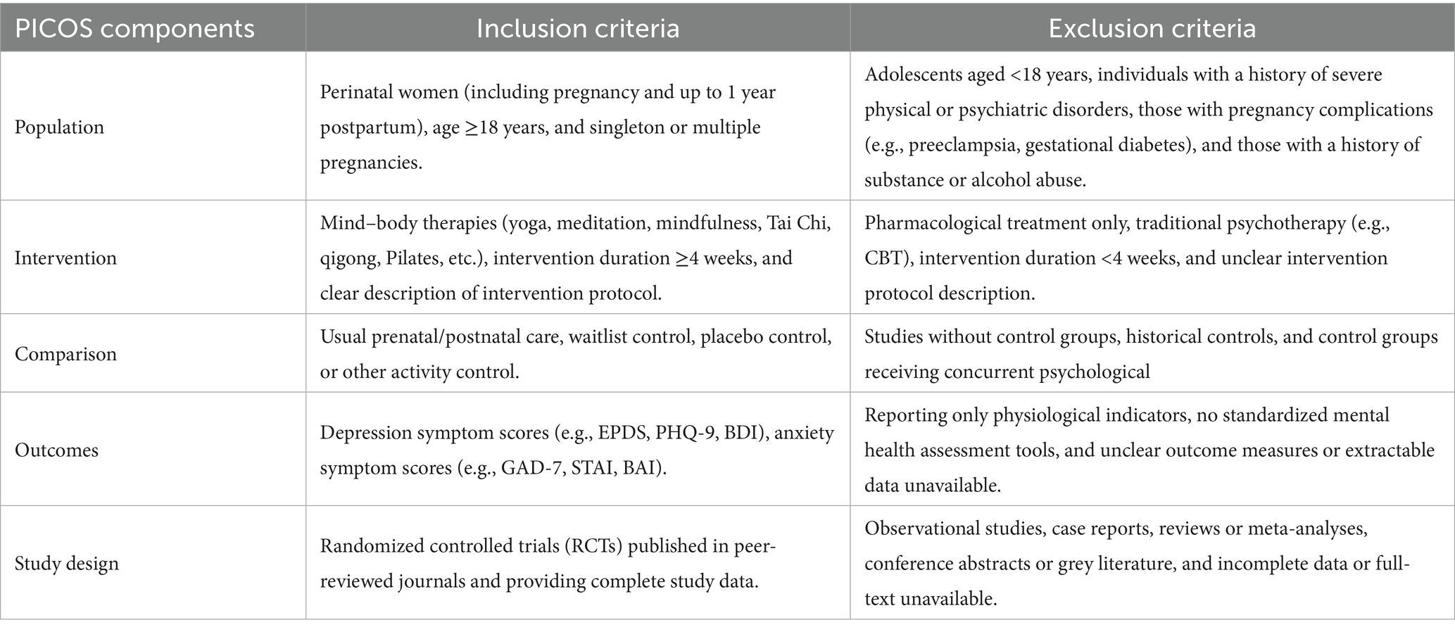 A meta-analysis was planned to estimate the pooled effect of mind–body exercise on perinatal depression and anxiety. All statistical analyses were conducted using Review Manager (Version 5.4). Effect sizes were calculated as mean differences (MD) when studies used the same outcome measure, or as standardized mean differences (SMD) when different measures were used, to allow for comparability. A random-effects model was pre-specified for pooling data if substantial heterogeneity was detected (I2 > 50%), while a fixed-effect model would be used for low heterogeneity (I2 < 50%). Where heterogeneity was high, subgroup analyses were planned to investigate potential sources of variation. A leave-one-out sensitivity analysis was planned to assess the influence of individual studies on the overall pooled estimate. Furthermore, univariate meta-regression analyses were planned for pre-specified moderators to explore potential effect modification. Based on theoretical considerations and prior evidence, we pre-specified subgroup analyses for three key moderating variables: (1) Intervention duration: a systematic review of internet-based interventions found that longer programs (>8 weeks) were more effective for depression and anxiety (20). As the median duration for psychological interventions in a previous meta-analysis was 9 weeks (21), we used an 8-week threshold to explore its potential moderating effect. (2) Intervention frequency: a meta-analysis by Tiemens et al. demonstrated that a higher session frequency during the initial months of treatment for depression was associated with better outcomes (22). (3) Session duration: research on brief psychotherapy indicates that 30-min sessions can be effective (23), while principles from cognitive psychology suggest that sustained attention wanes over time, potentially leading to cognitive fatigue in longer sessions (24). Therefore, this study used 30 min as a cutoff to explore the potential effect-modifying role of single-session duration.