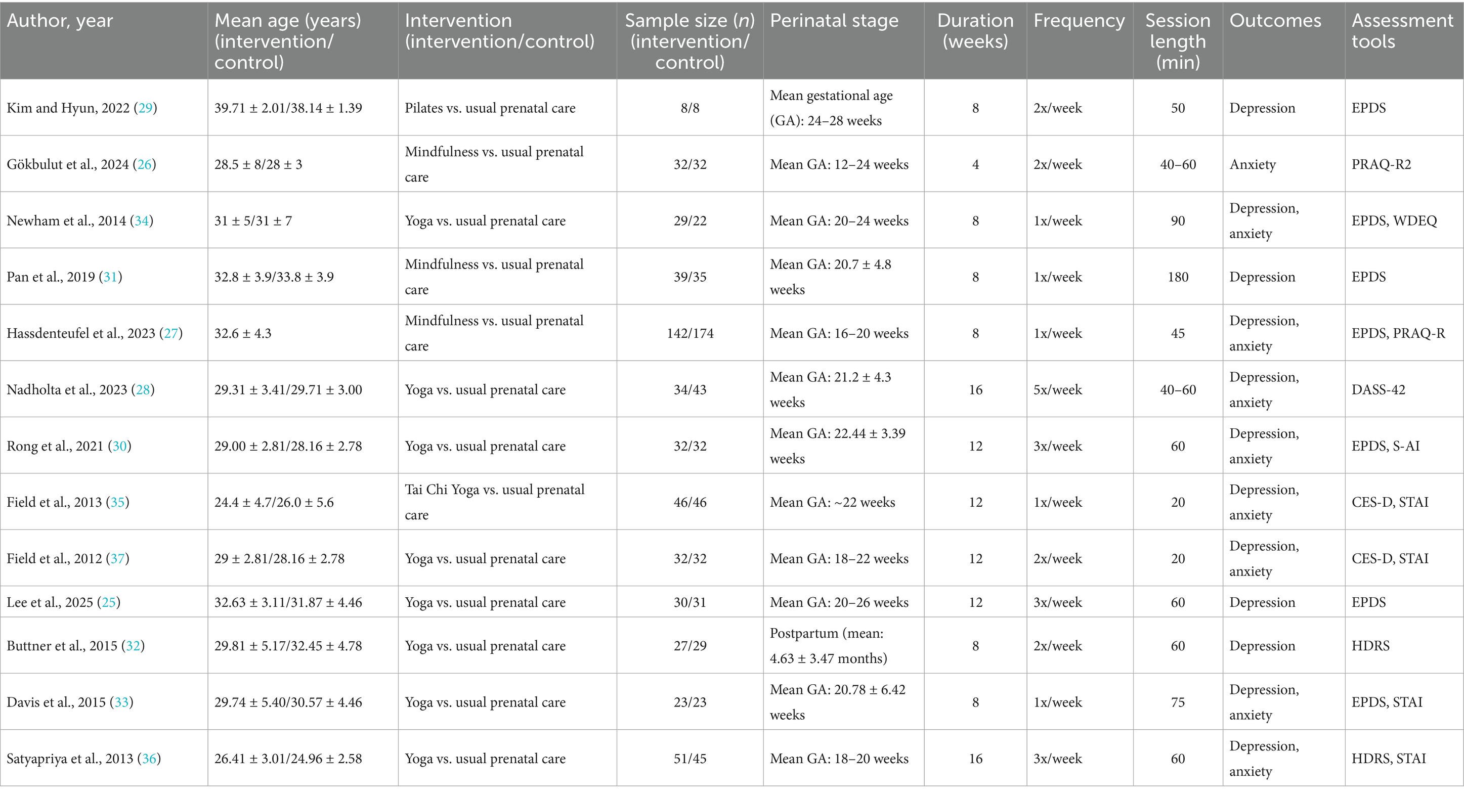 This study included 13 randomized controlled trials (25–37), published between 2012 and 2025 (25, 37), with a total sample size of 1,052 perinatal women (Table 3). The sample size of individual studies ranged from 16 to 316 participants, with the smallest being 16 (29) and the largest being 316 (27). Regarding population characteristics, the average age of participants ranged from 24.4 to 39.7 years (29, 37), with most subjects being in the 20–30 age group. The distribution of study phases showed that 12 studies intervened with pregnant women, while only one study specifically targeted postpartum women (32). Analysis of intervention types revealed that yoga was the most widely used form of mind–body exercise, accounting for 8 studies, followed by mindfulness interventions in 3 studies (26, 27, 31), Pilates in 1 study (29), and one study using a Tai Chi/yoga intervention (35). There were significant variations in intervention parameters. The duration of interventions ranged from 4 to 16 weeks (26, 28, 36), with 8-week interventions being the most common (27, 29, 31–34), followed by 12-week interventions (30, 35, 37). The frequency of interventions varied from once a week to five times a week (28, 34), with 2–3 times per week being the most prevalent. The duration of a single session ranged from 20 to 180 min (31, 37), with most studies adopting a moderate duration of 40–90 min. In terms of outcome assessment, eight studies evaluated both depressive and anxiety symptoms (27, 28, 30, 32–35, 37), 4 studies assessed only depressive symptoms (25, 29, 31, 36), and 1 study assessed only anxiety symptoms (26). A variety of measurement tools were used; depression was primarily assessed using the EPDS and CES-D scales (29, 35), while anxiety was mainly assessed using the STAI and PRAQ-R scales.