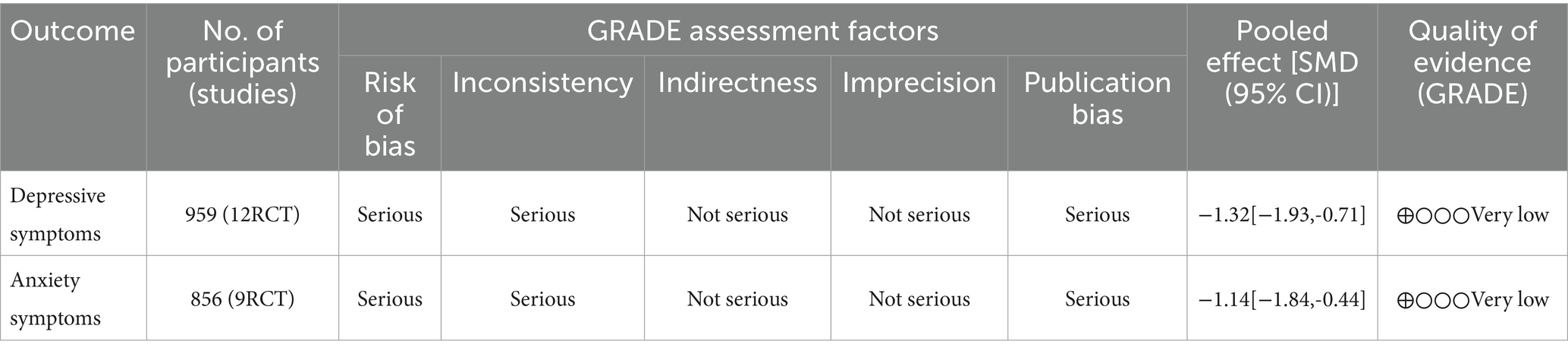 To explore the sources of heterogeneity, this study conducted subgroup analyses. The results showed that for the improvement of depressive symptoms, the duration and frequency of the intervention were important moderating factors. In contrast, the improvement of anxiety symptoms was not significantly associated with these parameters. Although the subgroup analyses provided some explanation, a high degree of heterogeneity remained within most subgroups, indicating the presence of other unidentified effect moderators. Finally, according to the GRADE system rating, the evidence quality for the two main outcomes of this study was “very low.” This rating is a composite of three factors: the high risk of bias prevalent in the included studies, significant inconsistency between studies, and detected publication bias. Therefore, although the pooled effect size shows a positive trend numerically, its evidence base is not yet solid, which limits the certainty and generalizability of the conclusion.