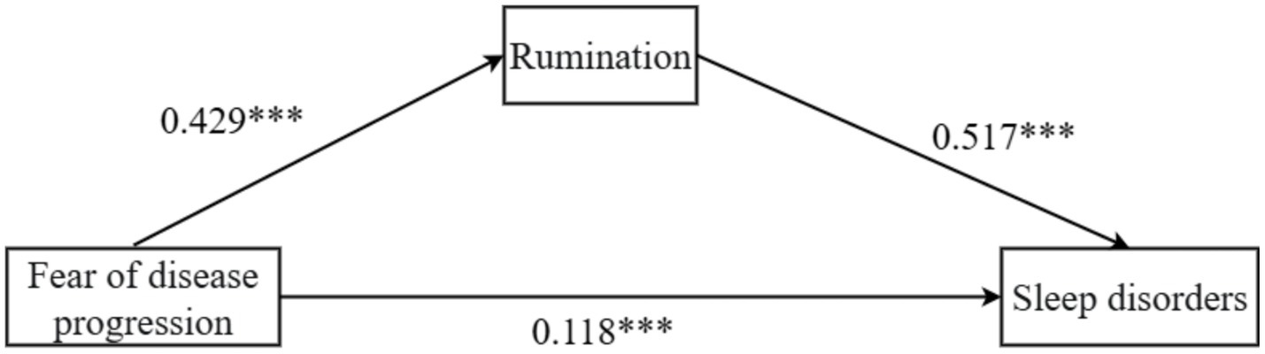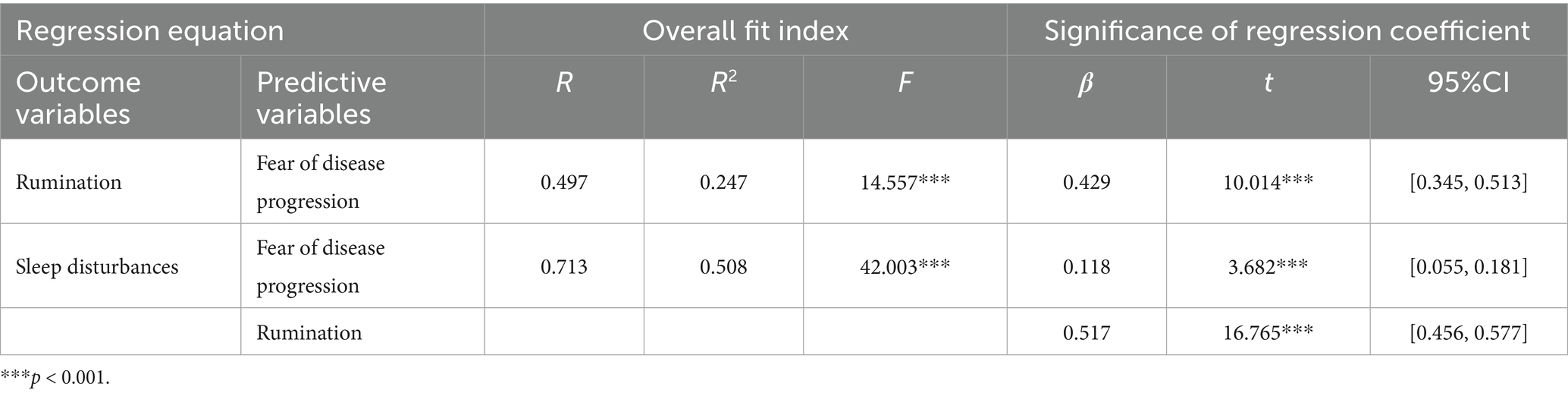 One-way ANOVA revealed that participants’ demographic information, including education background, marital status, occupation, children, residence, income, cancer stage, primary site, smoking, and drinking, significantly affected sleep disturbances, rumination, or fear of disease progression (p < 0.05). Therefore, we included these variables as control variables in the model, with rumination as a mediator, fear of disease progression as the independent variable, and sleep disturbances as the dependent variable, using Process Model 4 to test the mediating effect of rumination (Bootstrap sample: 5000).