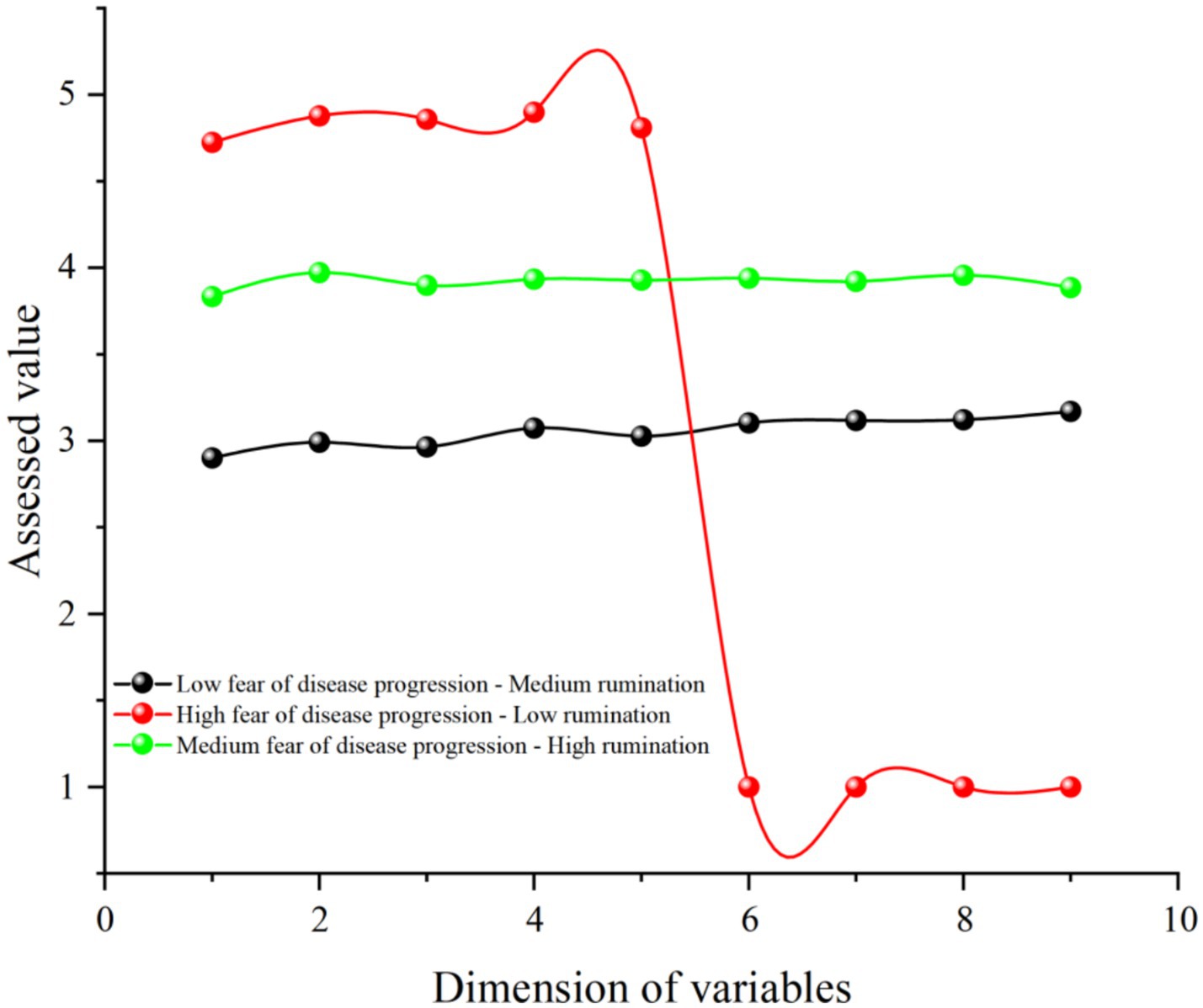 Figure 2. Potential subgroup profile of fear of disease progression and rumination in patients with melanoma. Dimensions 1–5 are fear of disease progression and dimensions 6–9 are rumination.