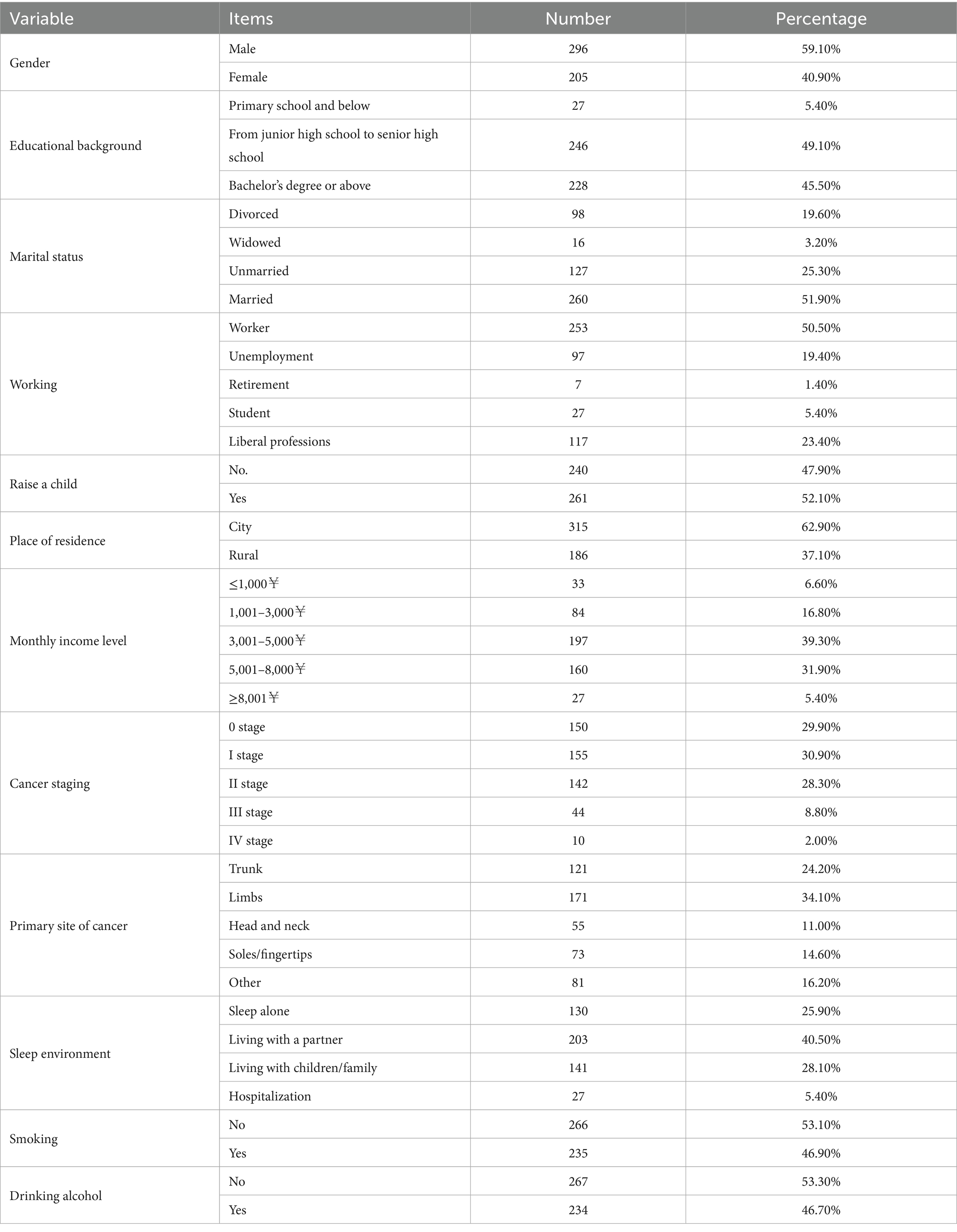 A total of 534 melanoma patients were recruited for this study. Among them, 16 participants had two or more comorbidities; 6 patients were currently undergoing treatment for sleep disturbances; and 3 patients had significant cognitive impairments. During the data cleaning phase, 3 incomplete questionnaires were filtered out, and 5 questionnaires with strong regularity in responses were excluded. Therefore, the effective sample size for this study was 501 questionnaires, resulting in a response rate of 93.82%. Of these, 296 were male patients (59.10%) and 205 were female patients (49.90%). The mean age of patients was 31.67 ± 9.363 years. Patients with education ranging from middle school to high school numbered 246 (49.10%), married patients totaled 260 (51.90%), and working patients accounted for 253 (50.50%). Detailed demographic information is presented in Table 1.