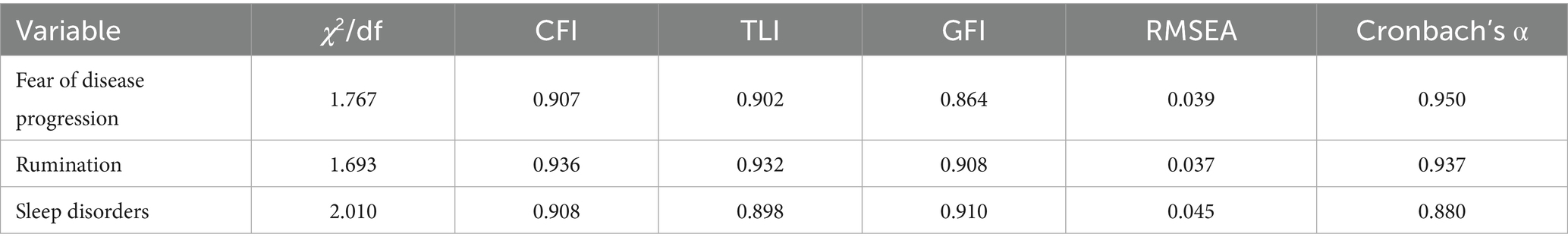 The measurement items for rumination are based on the Disease Rumination Scale developed by Soo and Sherman (51), which includes a total of 32 items across four dimensions: Intrusiveness (11 items), Instrumentality (8 items), Meaning-Seeking (4 items), and Reflection (9 items). This scale aims to assess individuals’ rumination in the context of physical illness, such as in breast cancer patients (51), adult cancer patients (52), and migraine patients (53). Additionally, Zhang et al. (54) adapted this scale into Chinese, validating its cultural adaptability and reliability in the Chinese patient population. A 5-point Likert scale was used for scoring (1 = strongly disagree, 5 = strongly agree), with higher scores indicating more severe rumination. Confirmatory factor analysis showed good model fit for the scale, and reliability analysis revealed excellent internal consistency, as shown in Table 2.