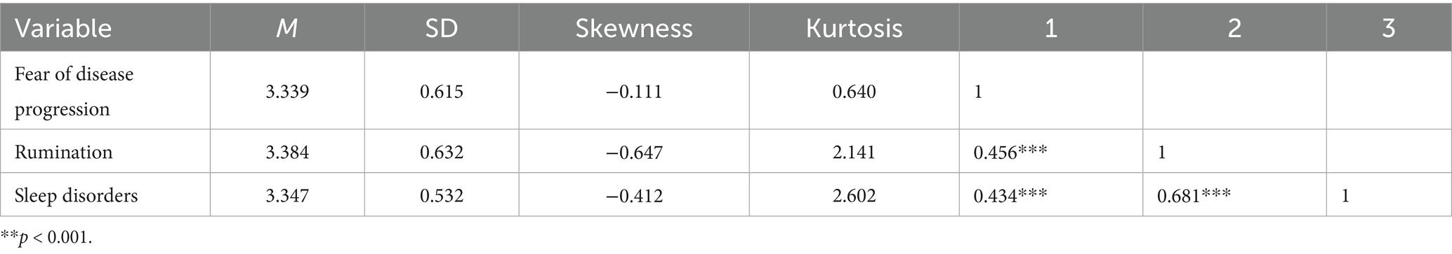 We conducted descriptive statistics and correlation analysis for fear of disease progression, sleep disturbances, and rumination, as shown in Table 3. The study found that fear of disease progression, rumination, and sleep disturbances ranged from 3.339 to 3.384, all exceeding the midpoint value of 2.5, indicating that melanoma patients experience high levels of fear regarding disease progression, rumination, and sleep disturbances. The skewness of the core variables ranged from −0.647 to −0.111, which is less than |3|, and the kurtosis ranged from 2.602 to 0.640, which is less than |10|. According to Kline (56), the core variables in this study conform to an approximately normal distribution.