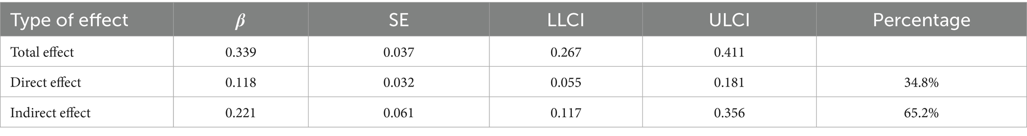 Further analysis of the mediation effect of rumination revealed that the total effect of fear of disease progression on sleep disturbances in melanoma patients was 0.339, with 65.2% of the effect being mediated by rumination, as shown in Table 5 and Figure 1. Fear of disease progression had a significant direct effect on sleep disturbances (β = 0.118, SE = 0.032, 95% CI = [0.055, 0.181]). At the same time, the mediating effect of rumination between fear of disease progression and sleep disturbances was significant (β = 0.211, SE = 0.061, 95% CI = [0.117, 0.356]).
