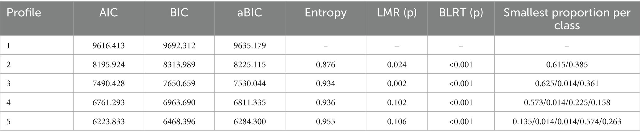 Next, we used Mplus 8 software to construct a latent profile model for the dimensions of fear of disease progression and sleep disturbances in melanoma patients. We developed a total of 1 to 5 latent profile models and assessed and selected the optimal fitting model. The model fit indices included AIC, BIC, aBIC, LMR, BLRT, and Entropy. AIC (Akaike Information Criterion), BIC (Bayesian Information Criterion), and aBIC (Sample-Size Adjusted BIC) values are lower for models comparing k profiles to k-1 profiles, indicating greater accuracy of the profile model. A p-value of LMR (Lo–Mendell–Rubin Likelihood Ratio Test) and BLRT (Bootstrapped Likelihood Ratio Test) less than 0.05 indicates that the K-class model is superior to the K-1 model. Entropy measures the precision and certainty of profile classification, with higher Entropy indicating smaller classification errors. The better the distinction between profiles, the more effective the classification.