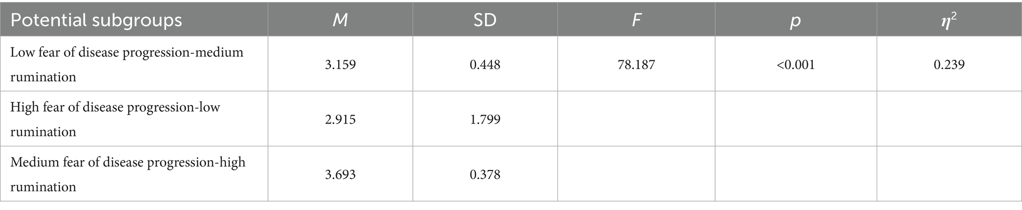 One-way ANOVA of the latent subgroups and sleep disturbances, as shown in Table 7, revealed that the sleep disturbances of the moderate fear of disease progression-high rumination subgroup (M = 3.693, SD = 0.378) were significantly higher than those of the low fear of disease progression-moderate rumination subgroup (M = 3.159, SD = 0.448) and the high fear of disease progression-low rumination subgroup (M = 2.915, SD = 1.799). Therefore, the latent subgroups of fear of disease progression and rumination in melanoma patients significantly affect sleep disturbances [F(2, 498) = 78.187, p < 0.001, η2 = 0.239].